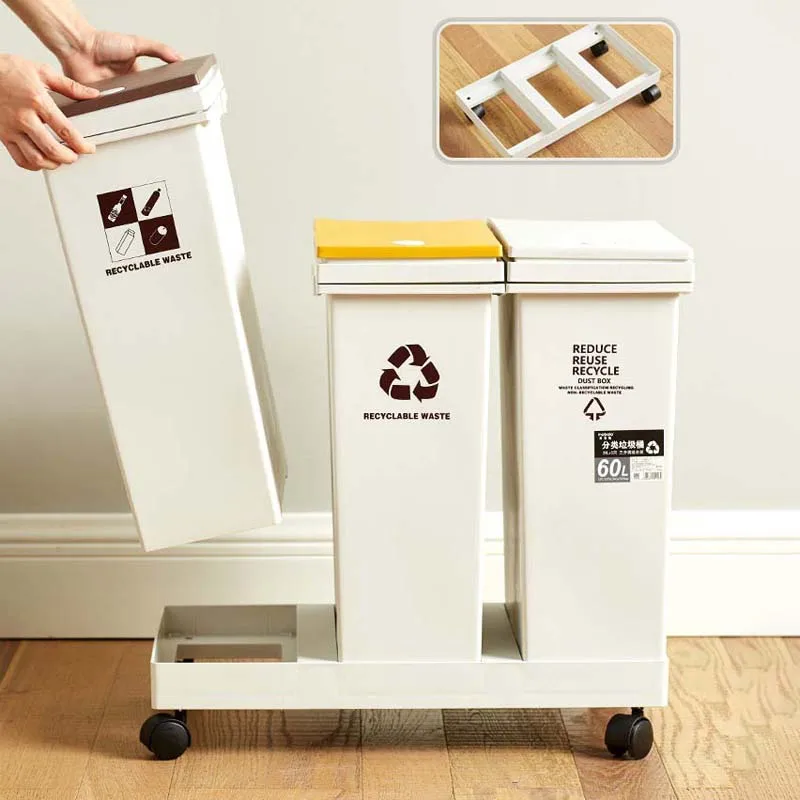 Movable 3 Compartment Plastic Trash Can with Lid Pressing Type Pedal Design Outdoor Kitchen Waste Open Top Structure Home Use