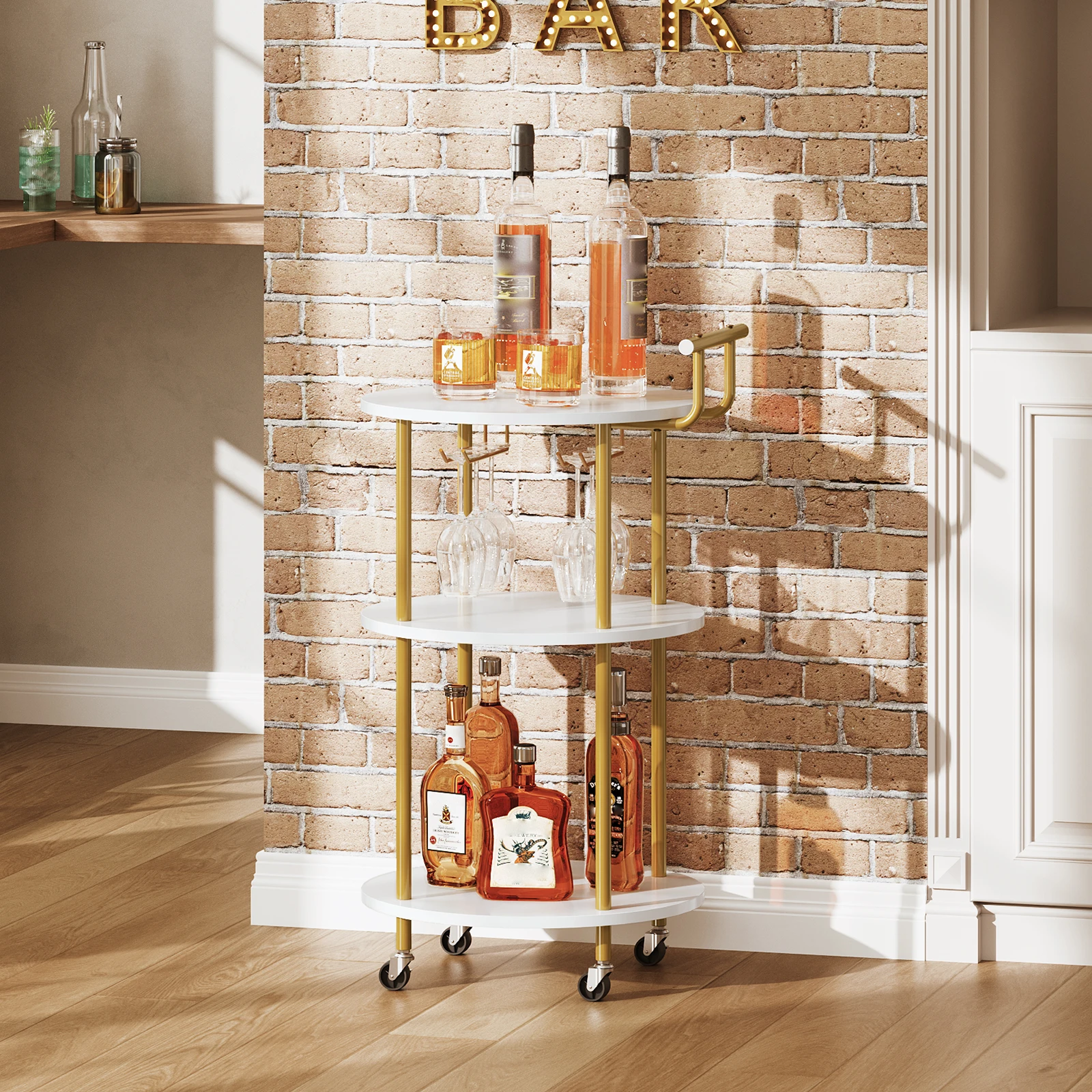 Free Movement, Lockable: The stylish gold bar cart has 4 swivel wheels (2 with brakes) and a comfortable golden handle, allowing you to freely attend every family gathering and cocktail party, creating a sense of ceremonial living anytime, anywhere Compact Size, Ample Space: This serving cart sizes 15.7"L x 15.7"W x 33.4"H, suitable for small spaces. The bar cart offers 3 open storage shelves and 2 rows of glass holders, making it easy to arrange and access beverages, glassware, fruit trays, and more Simple and Stylish: This rolling wine cart with handle adopts elegant white and bright gold colors, fashionable and luxurious. The golden frame with white panels, creating a minimalist design that exudes sophistication and enhances your taste Sturdy and Safe: The gold bar cart is made of high-quality particleboard and sturdy metal frame, combined with a compact structure, ensuring overall stability. Each shelf can easily hold up to 55 lb, meeting your storage and weight-bearing needs Easy to Assemble: This 3-tier bar cart comes with necessary accessories and assembly instructions. Its simple structure, compact size, and lightweight make the assembly effortless. All you need to do is follow the step-by-step guide for assembly