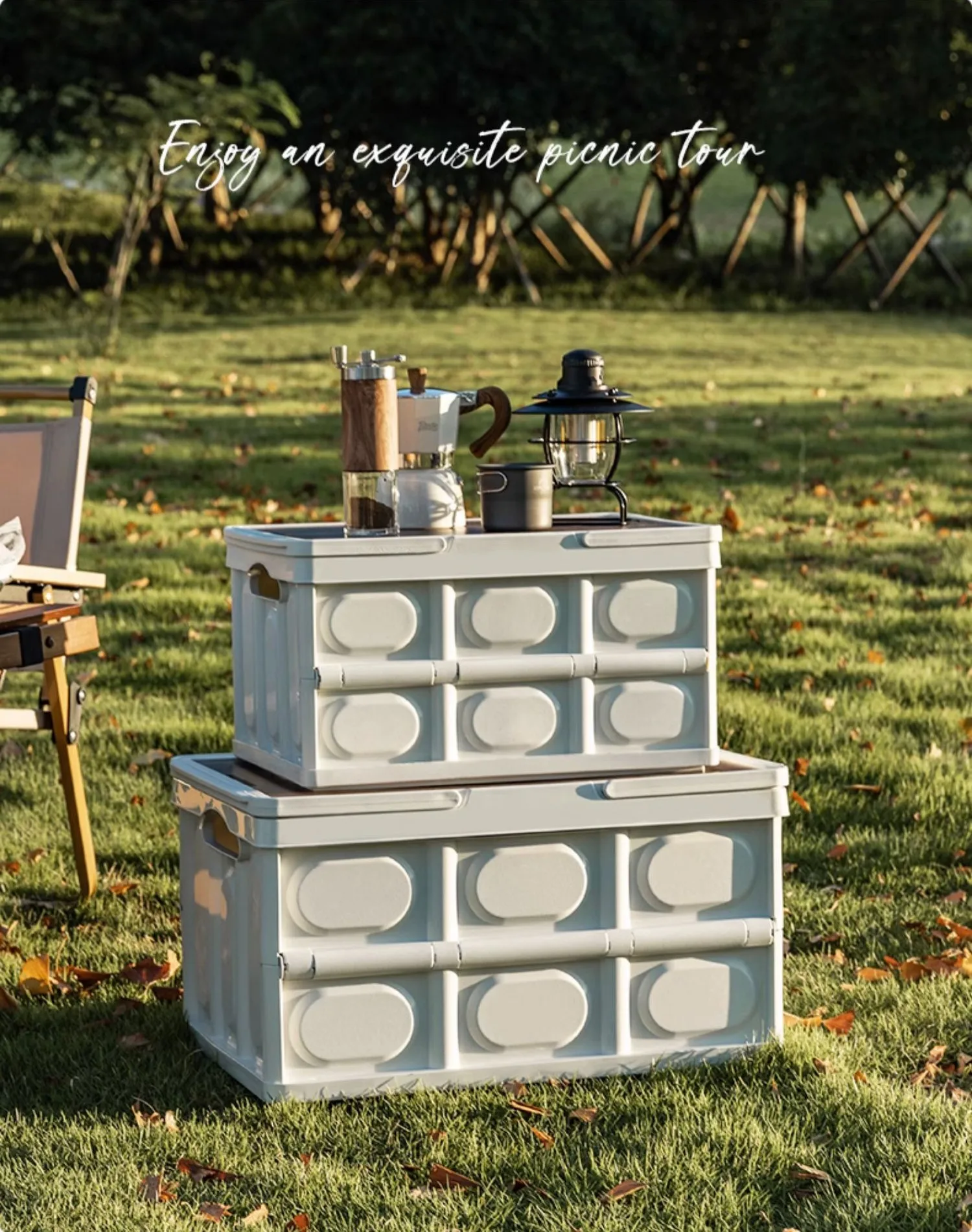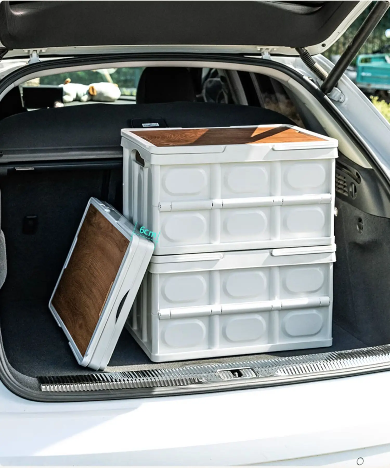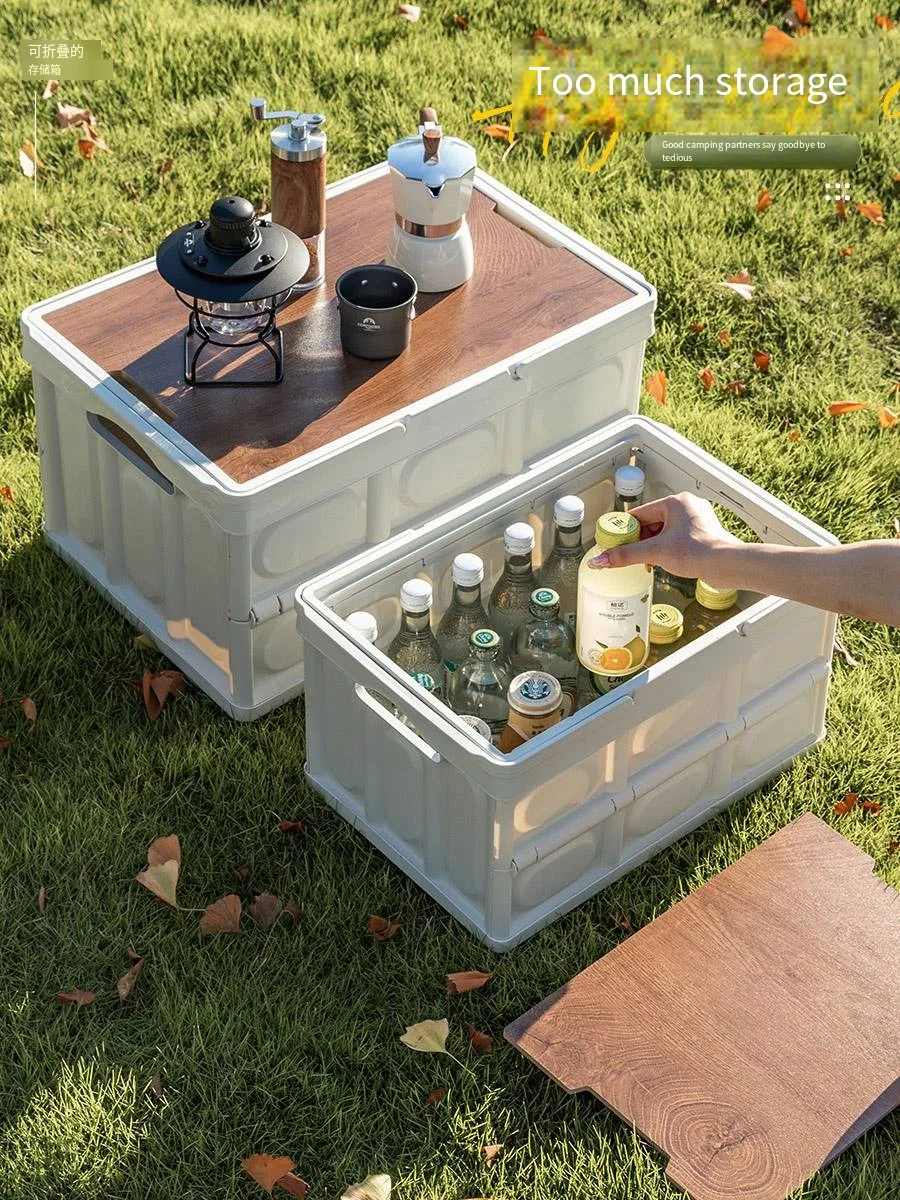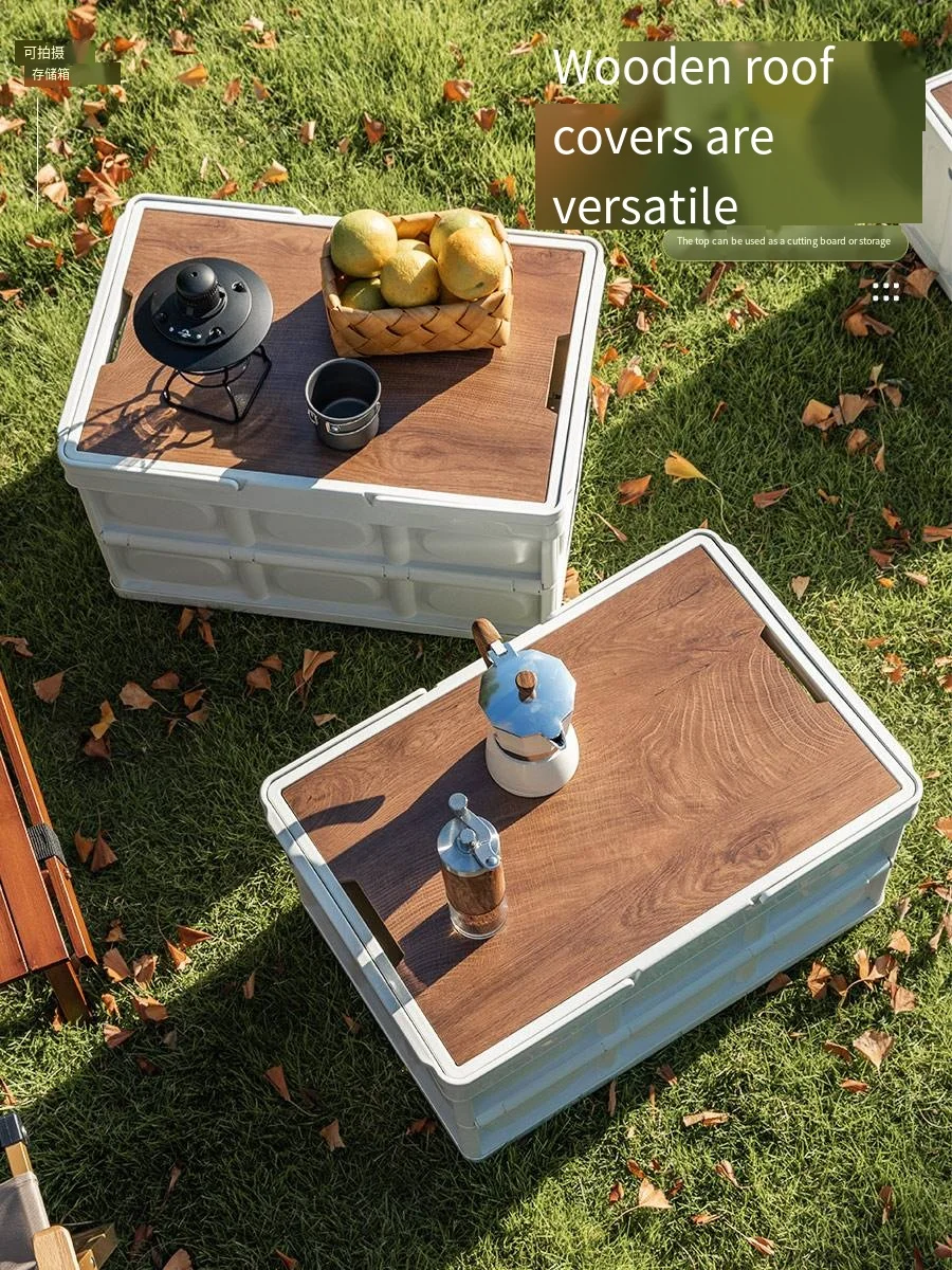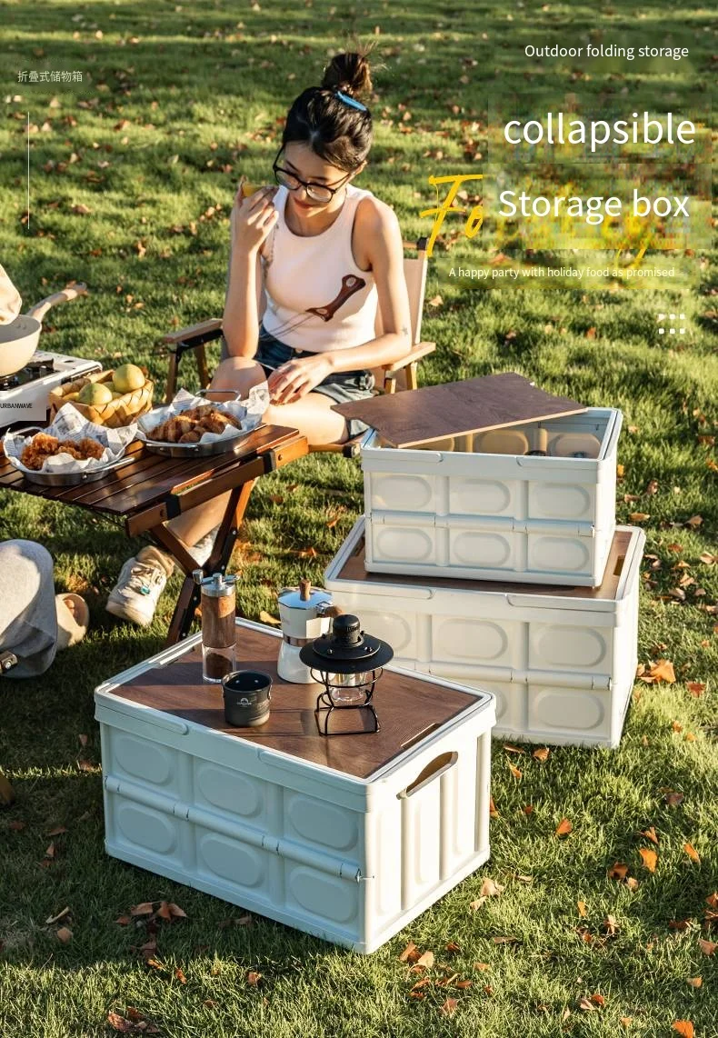 Wholesale Camping Foldable Plastic Storage Box With Wooden Lid Stackable Collapsible Outdoor Handle Storage Bin