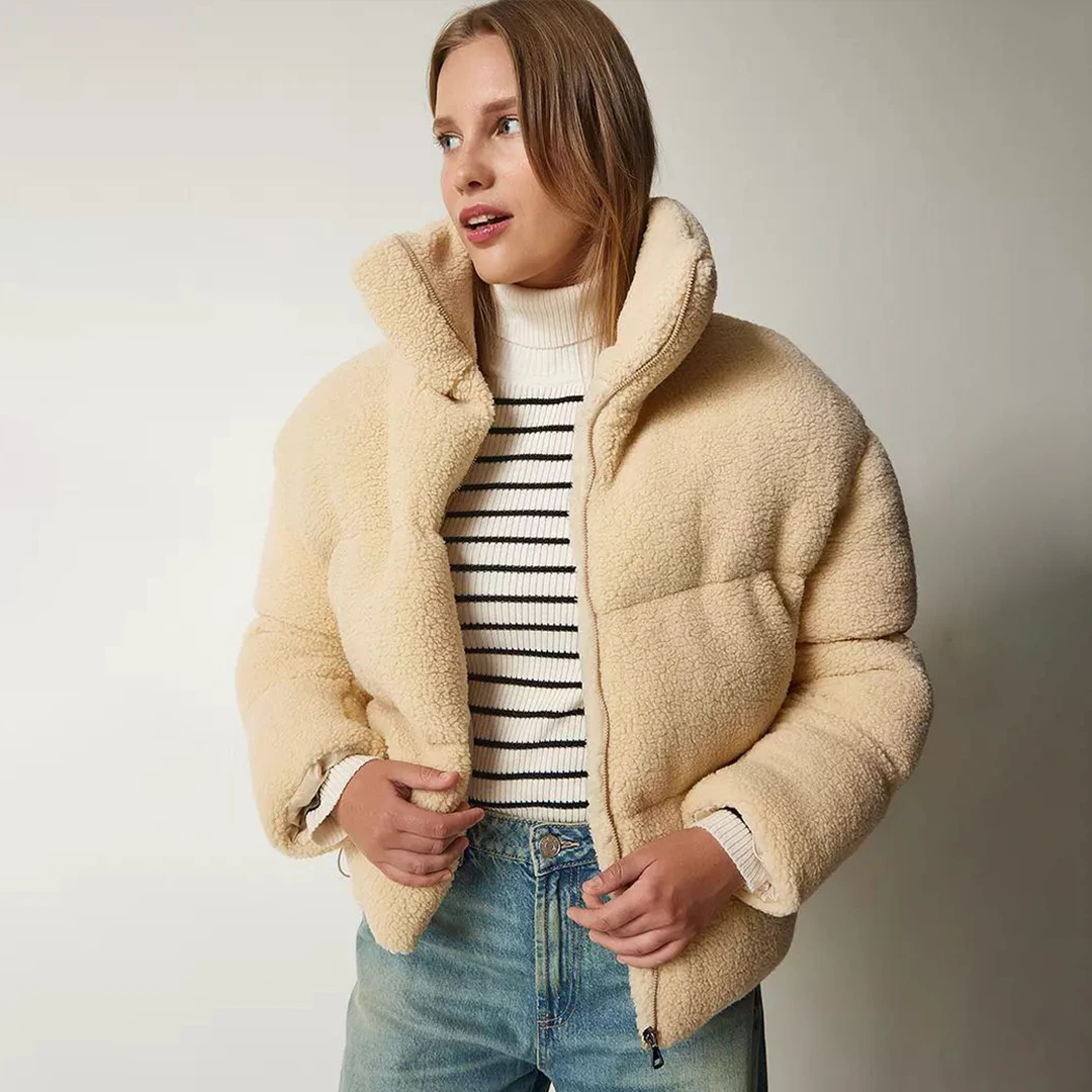 OEM ODM Custom winter clothes for women full pile thickening puffer jacket sherpa fleece fabric fuzzy jacket for women