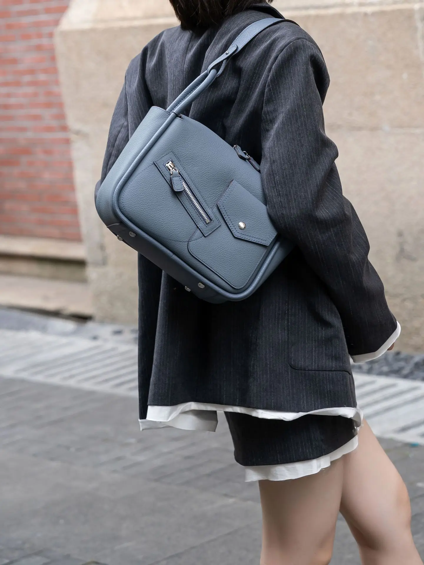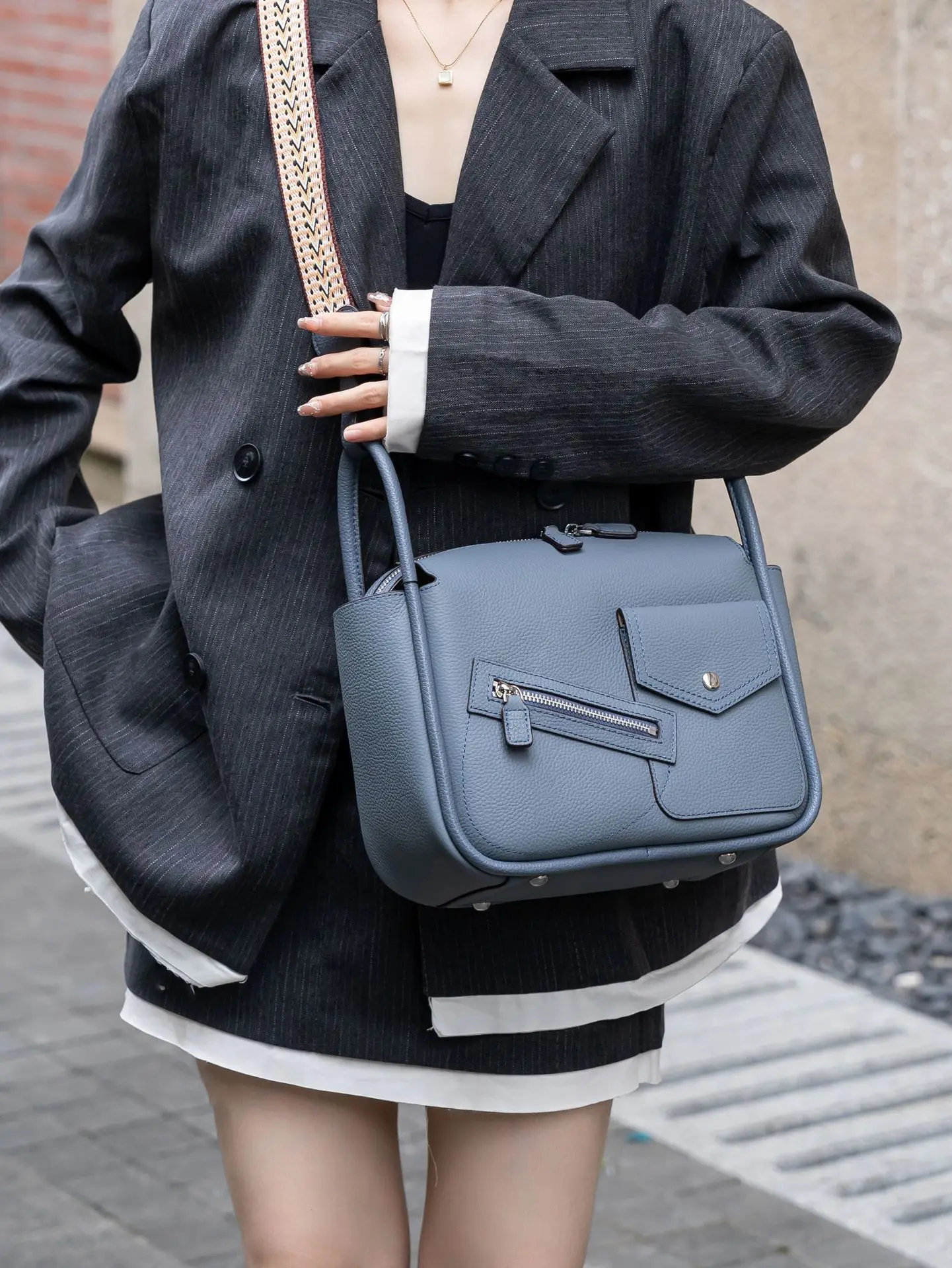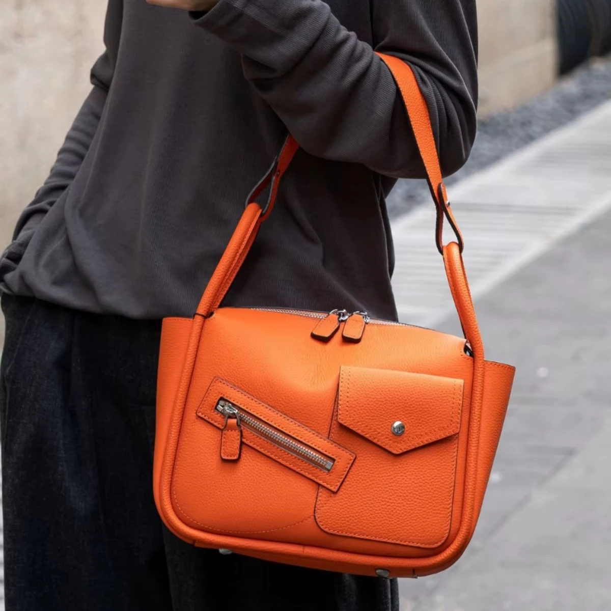 The first-layer cowhide bag is slung over the shoulder.
