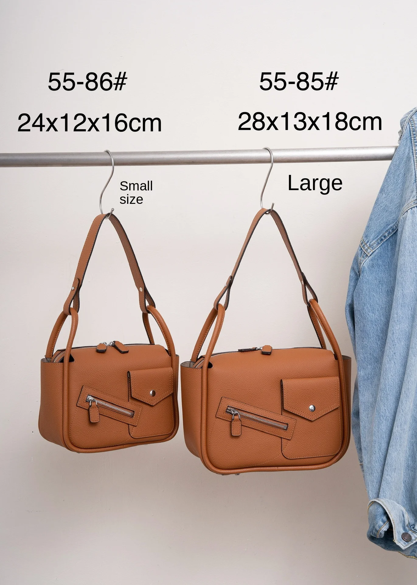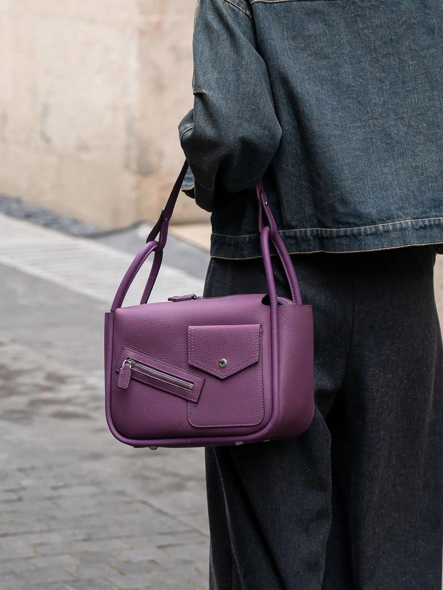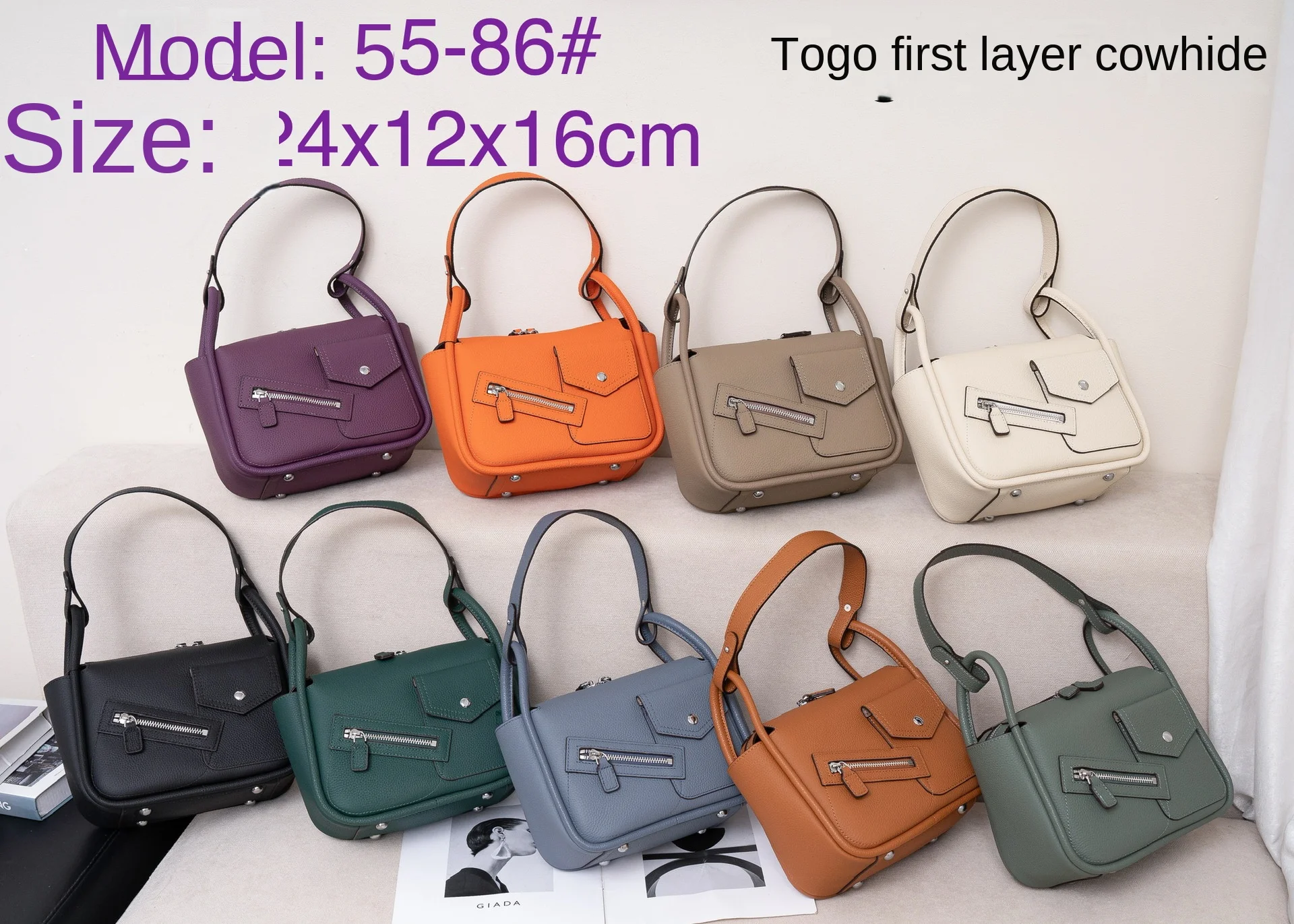 The first-layer cowhide bag is slung over the shoulder.