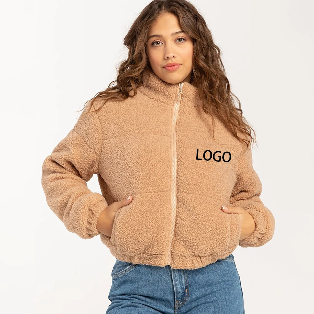 OEM ODM Custom embroidered logo zip up sherpa fleece jacket fuzzy oversized winter clothes for women teddy jacket
