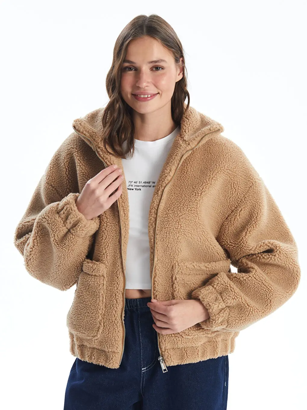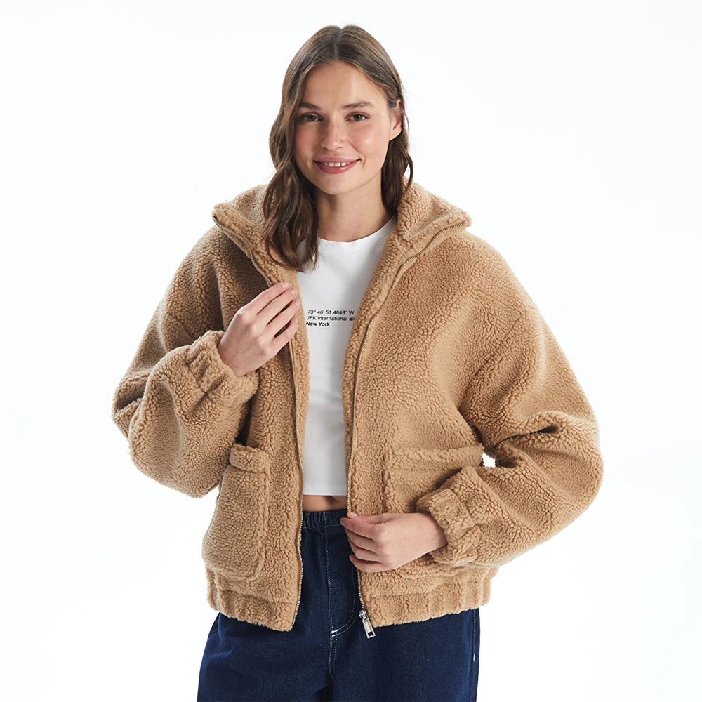 Custom Winter Clothes For Women Fur Coat Zip Up Sherpa Fleece Teddy Jacket Women's High Collar Plain Teddy Coat