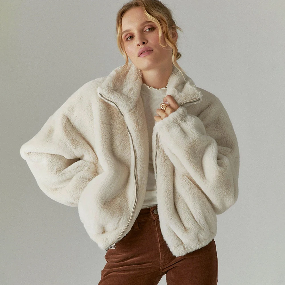 Factory Custom Embroidery Fabric Logo Fleece Jacket High Quality Plush Fleece Zip Up Faux Rabbit Fur Coat