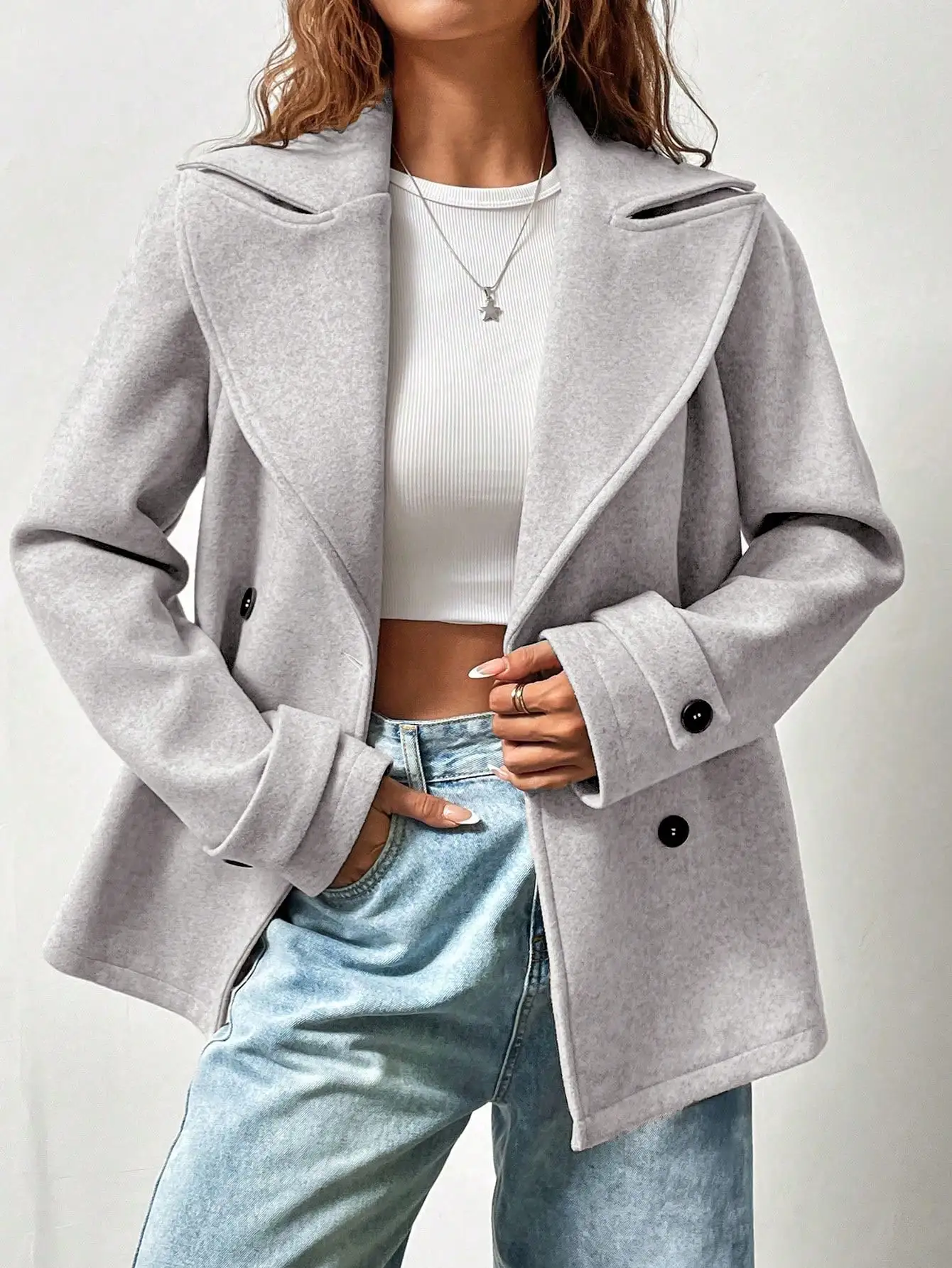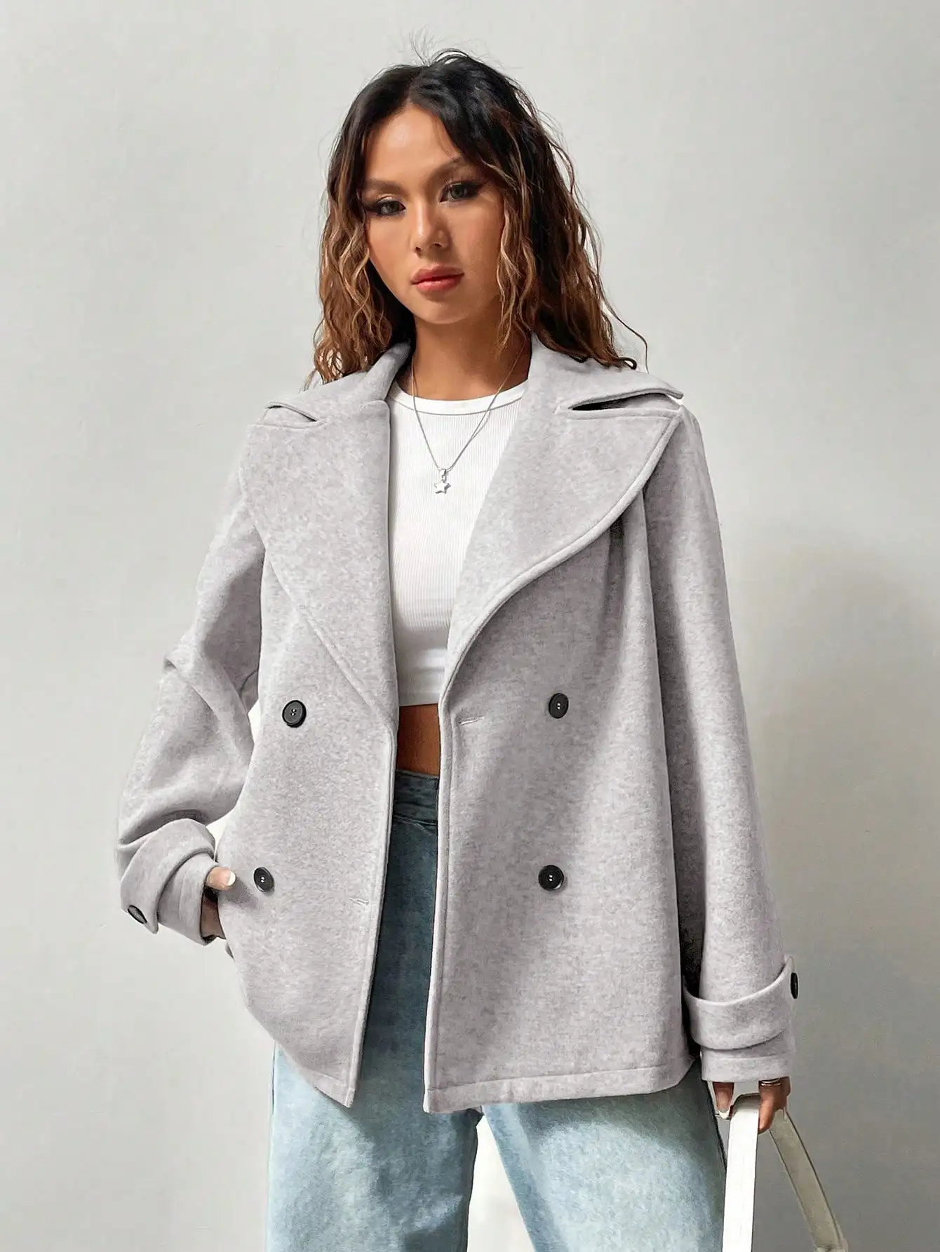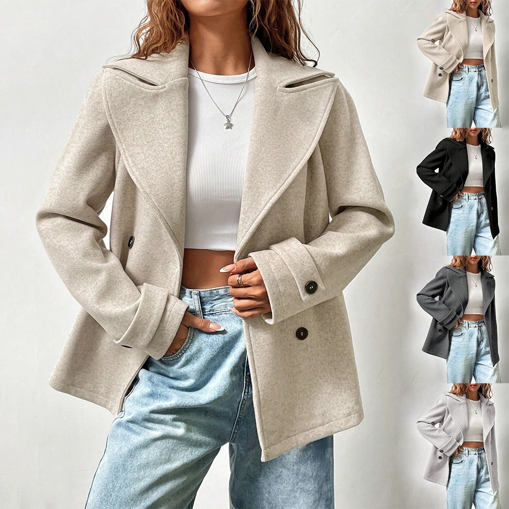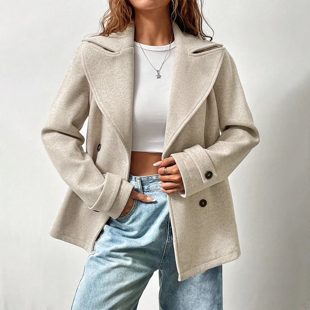 OEM ODM Custom Logo Polar Fleece Jacket Women's Solid Color Turndown Collar Long Sleeve Double-Breasted Casual Woolen Coat