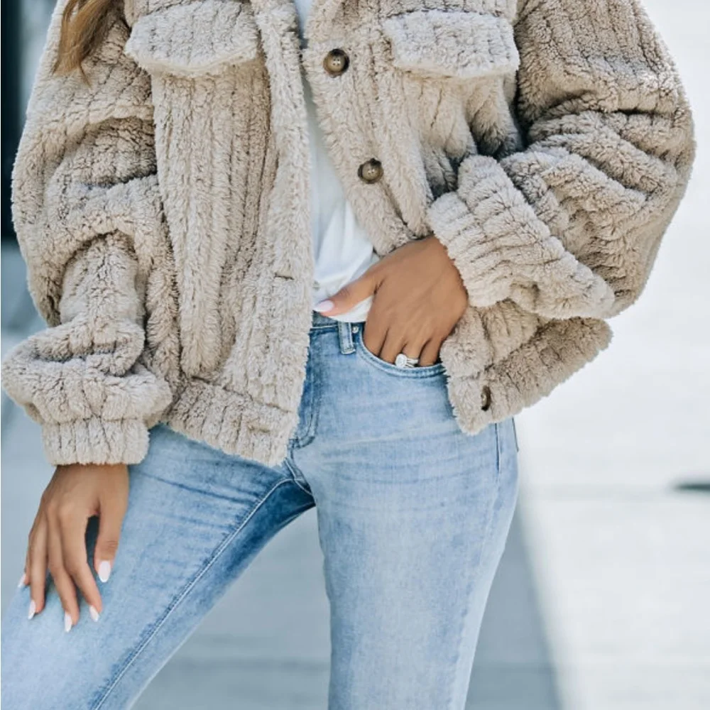 OEM ODM Custom Fabric Logo Fleece Coat High Quality Pocket Long Sleeve Plush Fleece Button Up Jacket