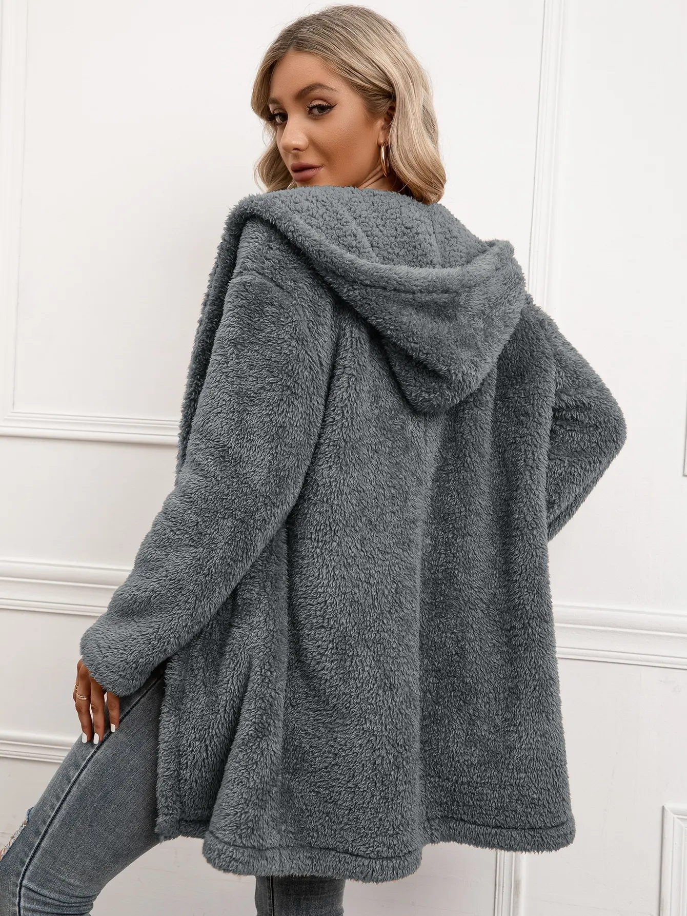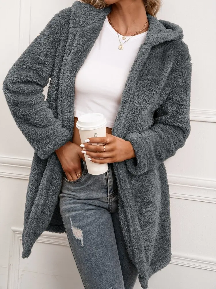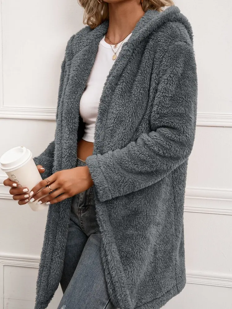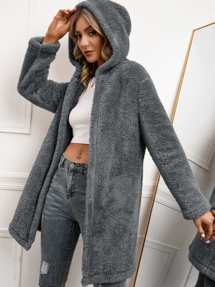 OEM Custom Winter Clothes For Women Plus Size Thick Fleece Long Fur Coat Cardigan Warm Open Front Hooded Sherpa Fleece Jacket