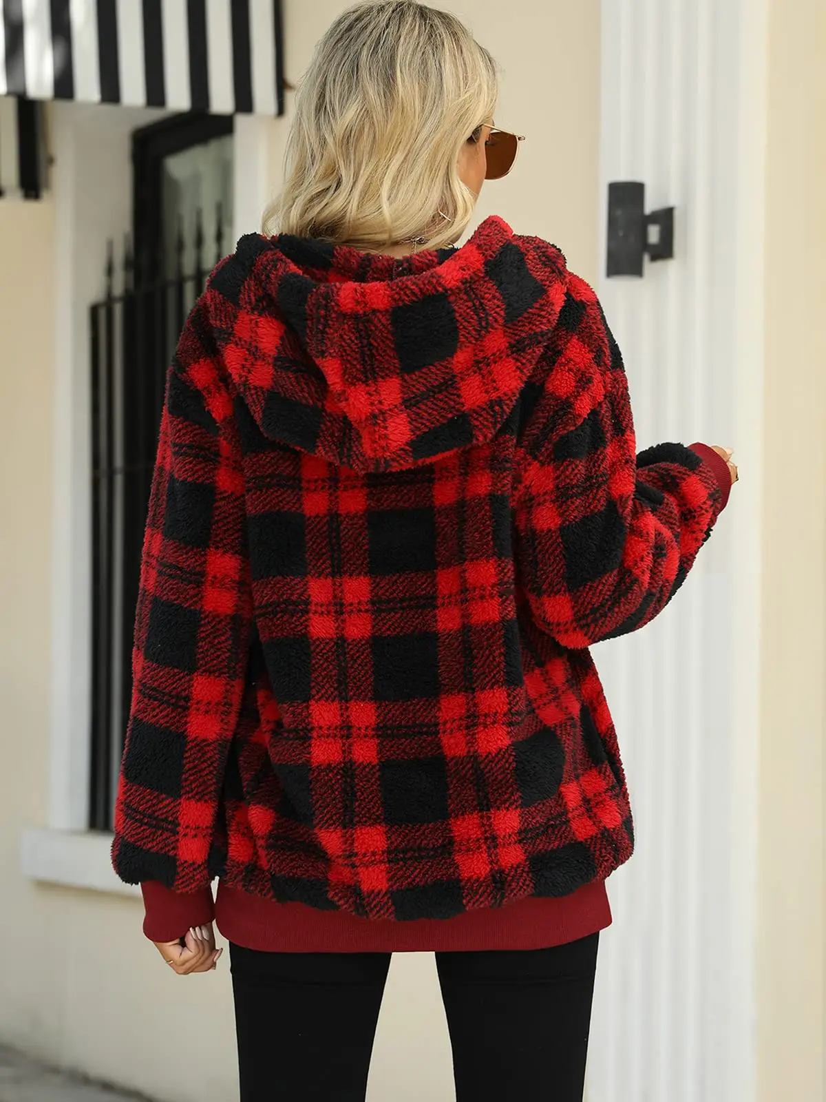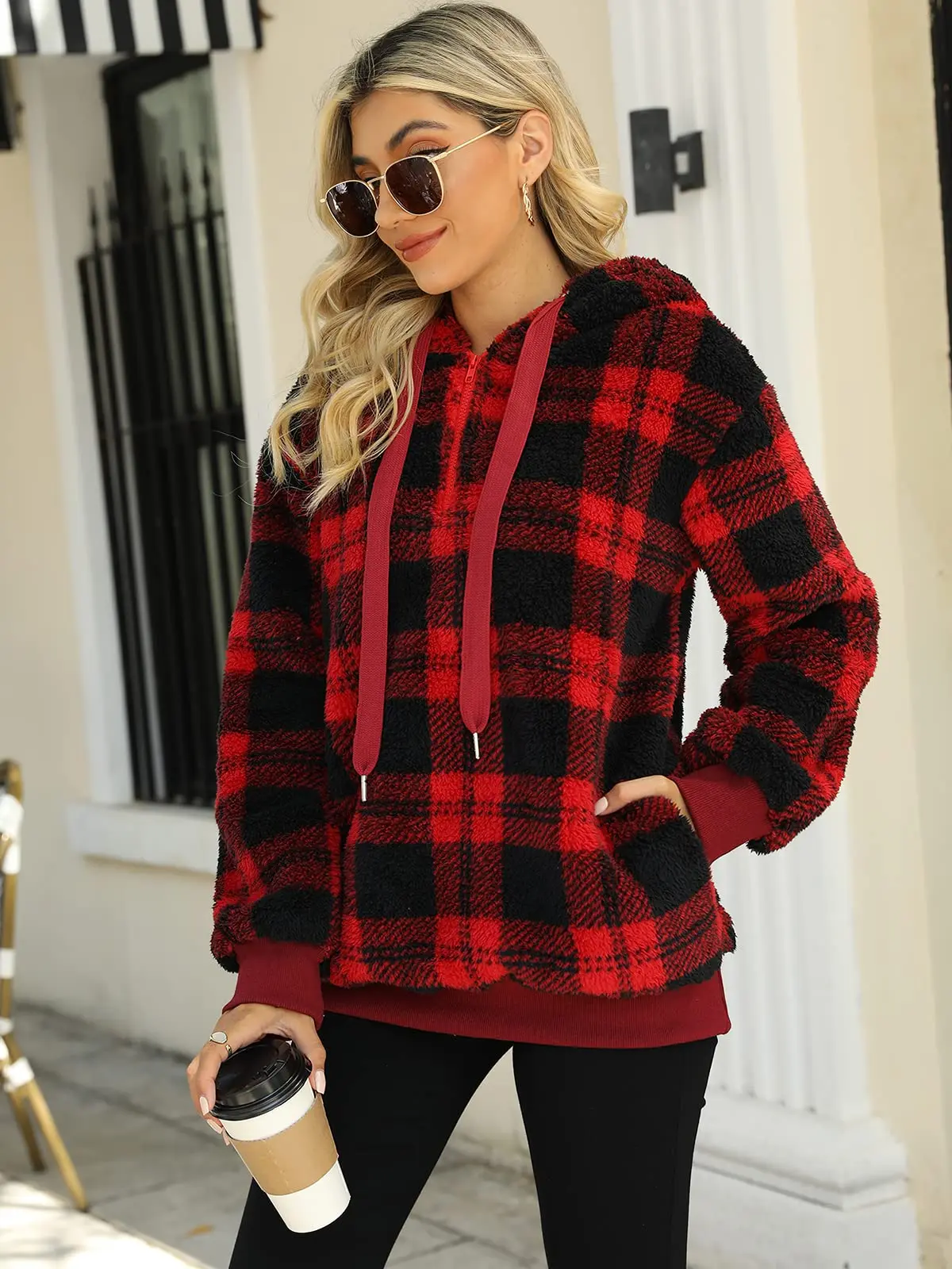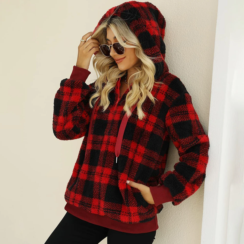 Custom Winter Clothes For Women With Pockets Hoodie Fuzzy Fleece Pullover Sherpa Fleece Jacket A Plaid Black Hoodie