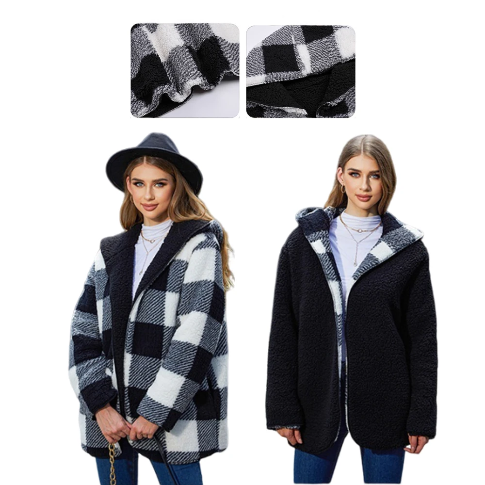 Wholesale 690gsm Womens Plaid Fuzzy Fleece Sherpa Jacket Women's Coat Reversible Winter Clothes Fur Coat Women