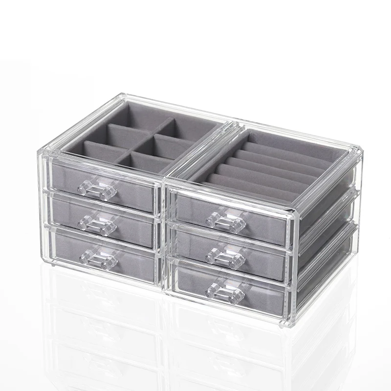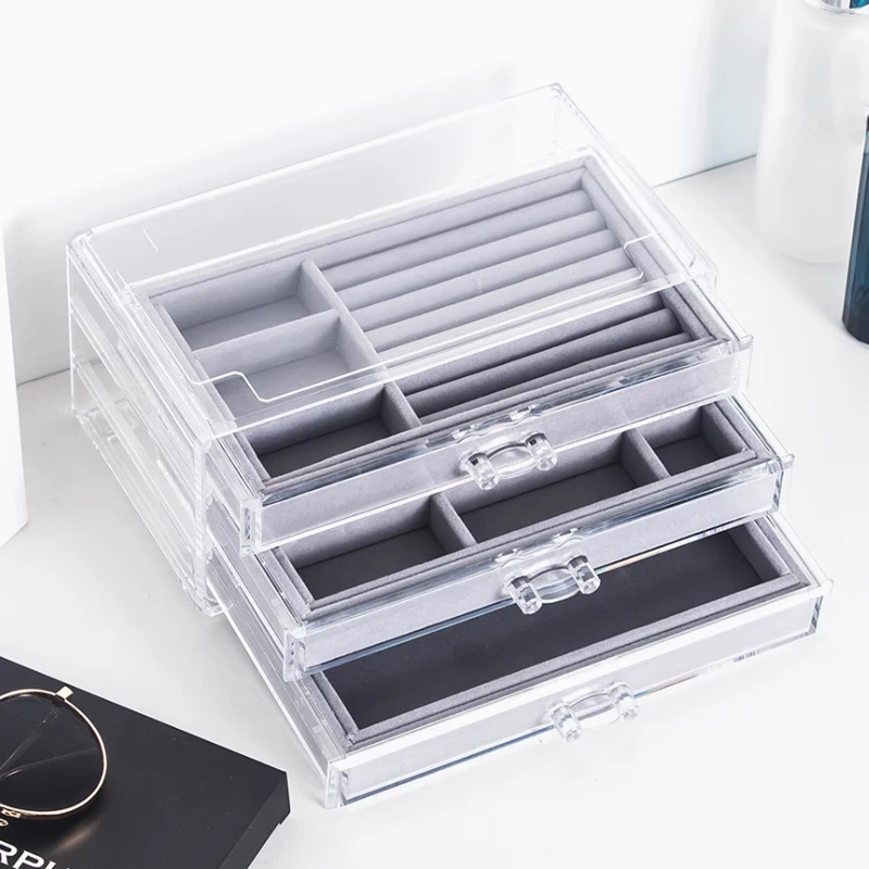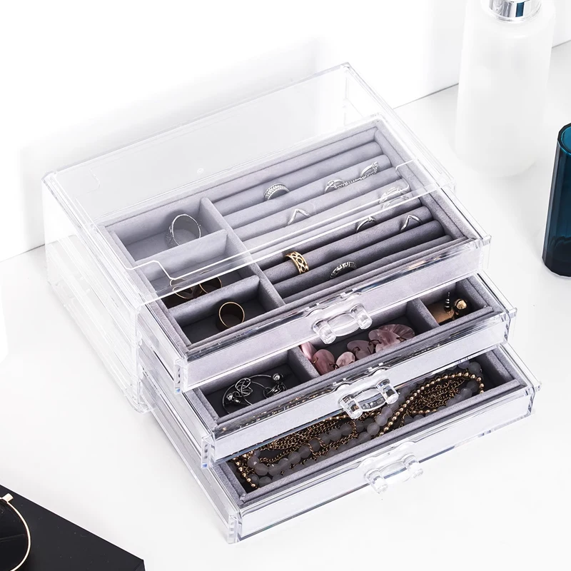 Stackable Clear Acrylic Jewelry Organizer Box W/ 3 Drawer Velvet Tray For Rings Earrings Necklace Watches Storage Display Holder