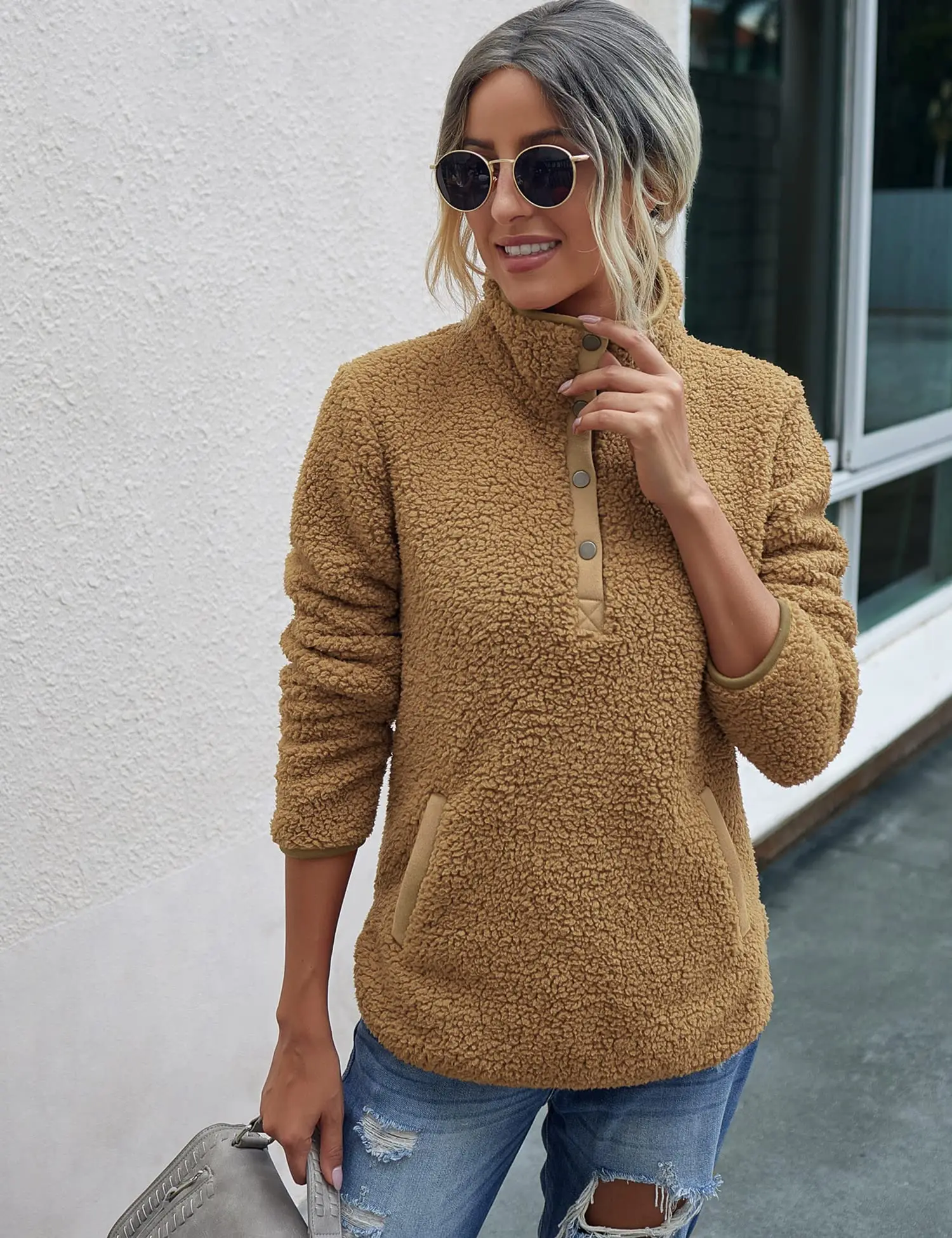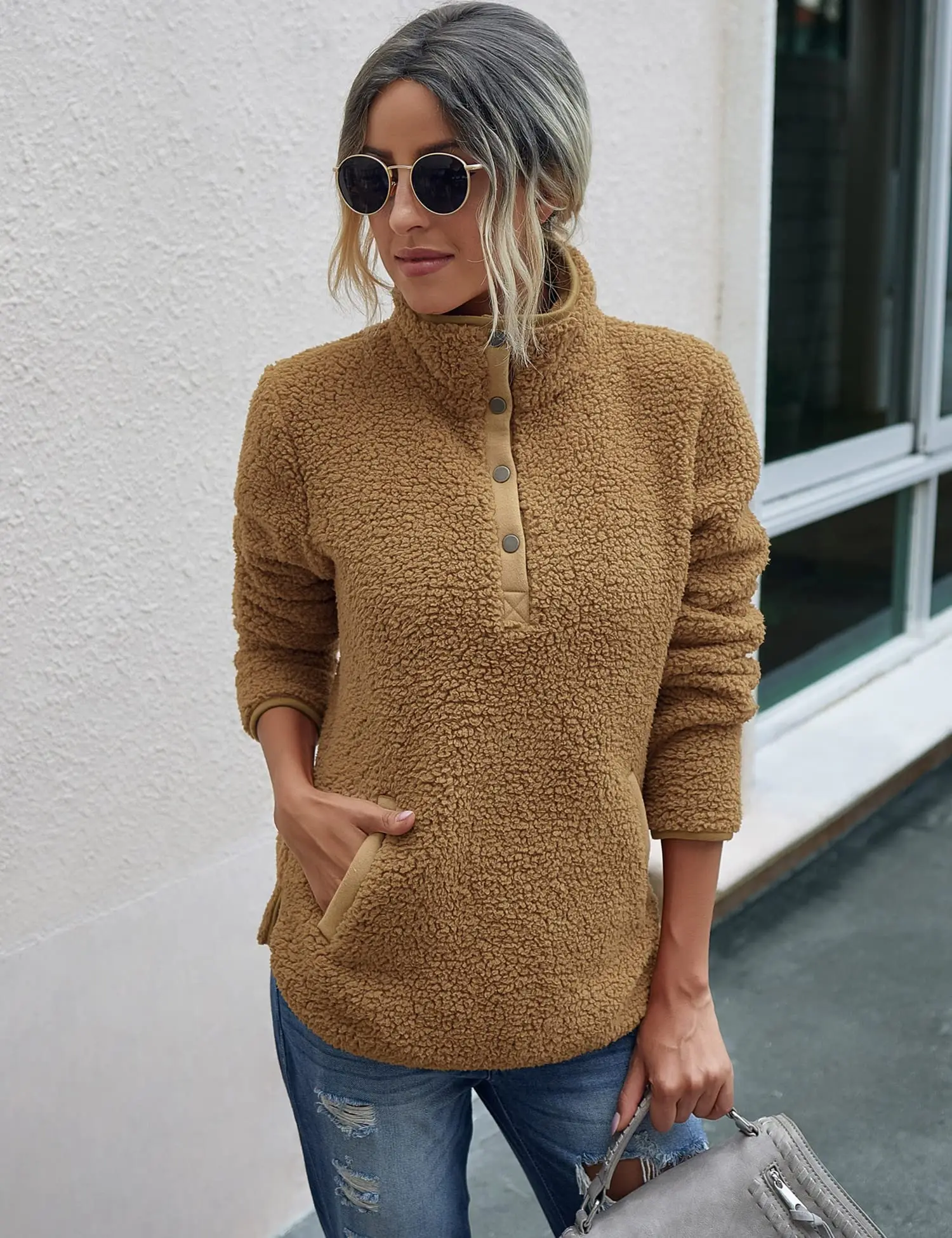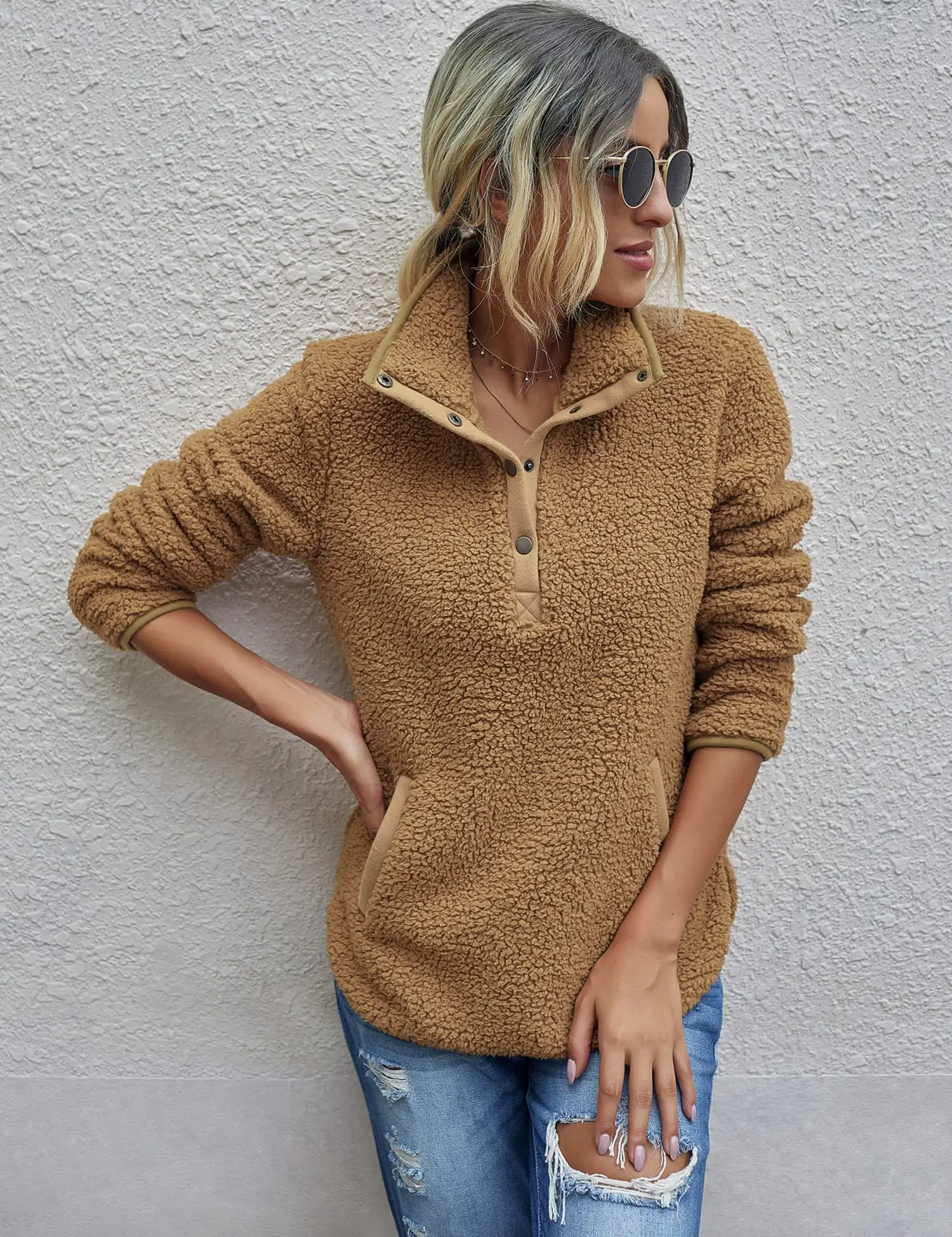 OEM Custom Women's fuzzy sherpa full zip teddy coat fur thick warm pile fleece outwear pockets fleece jacket for women