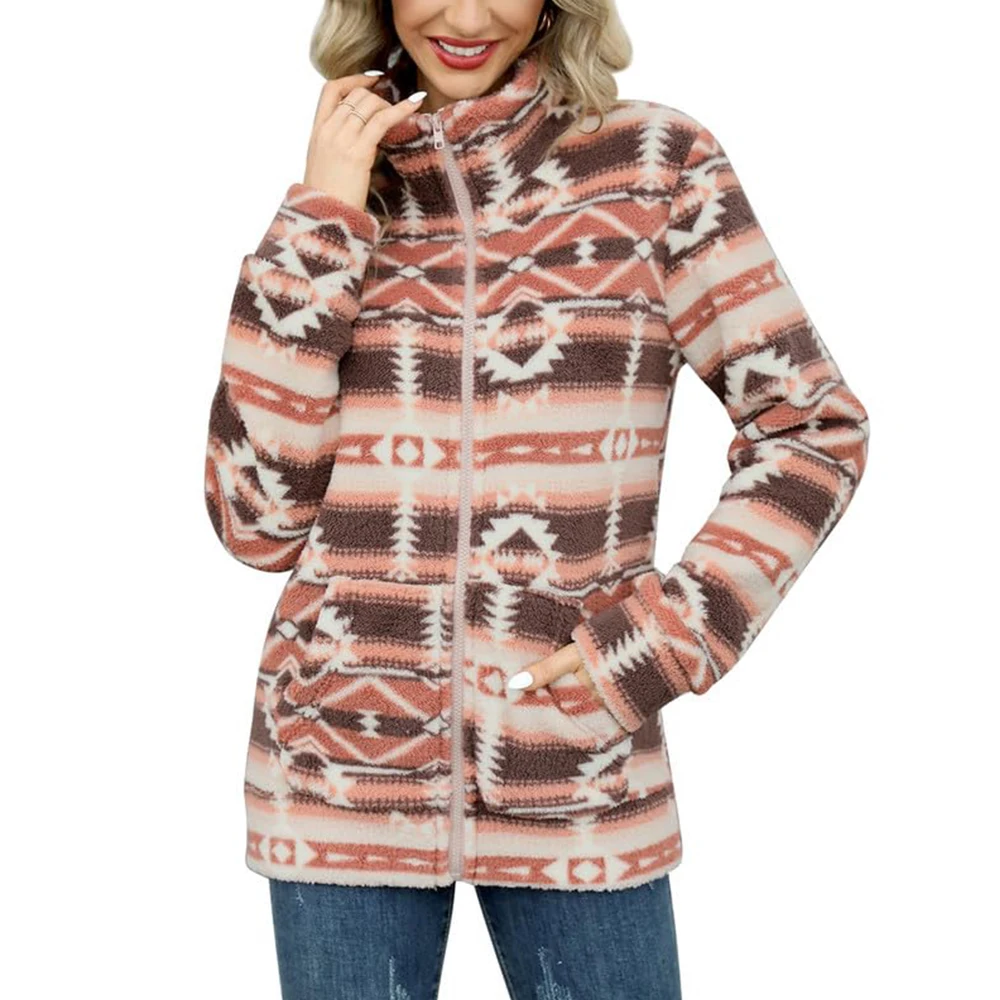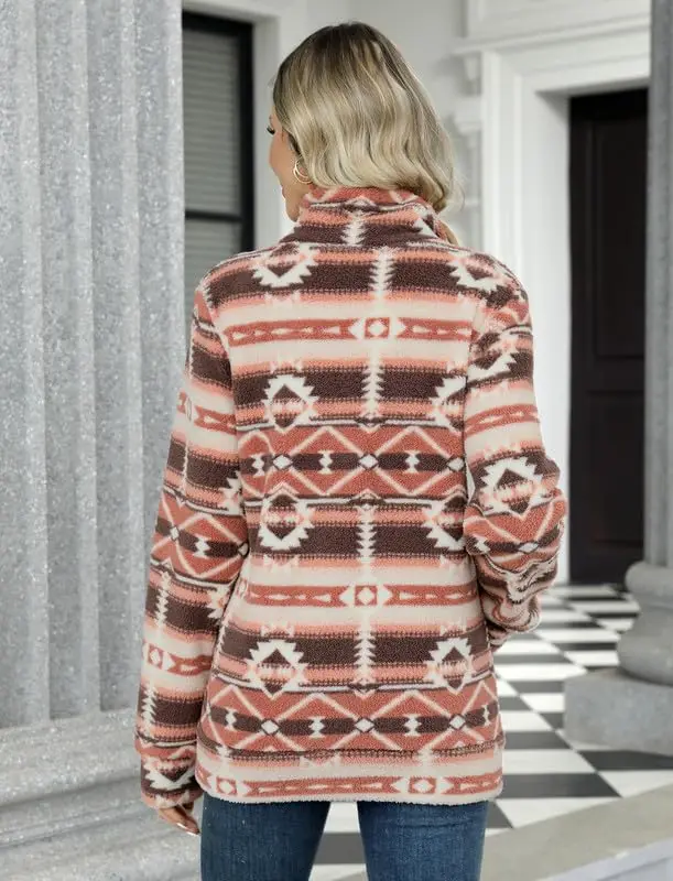 Western Aztec fuzzy sherpa full zip teddy coat fur thick warm pile fleece outwear pockets houndstooth fleece jacket for women