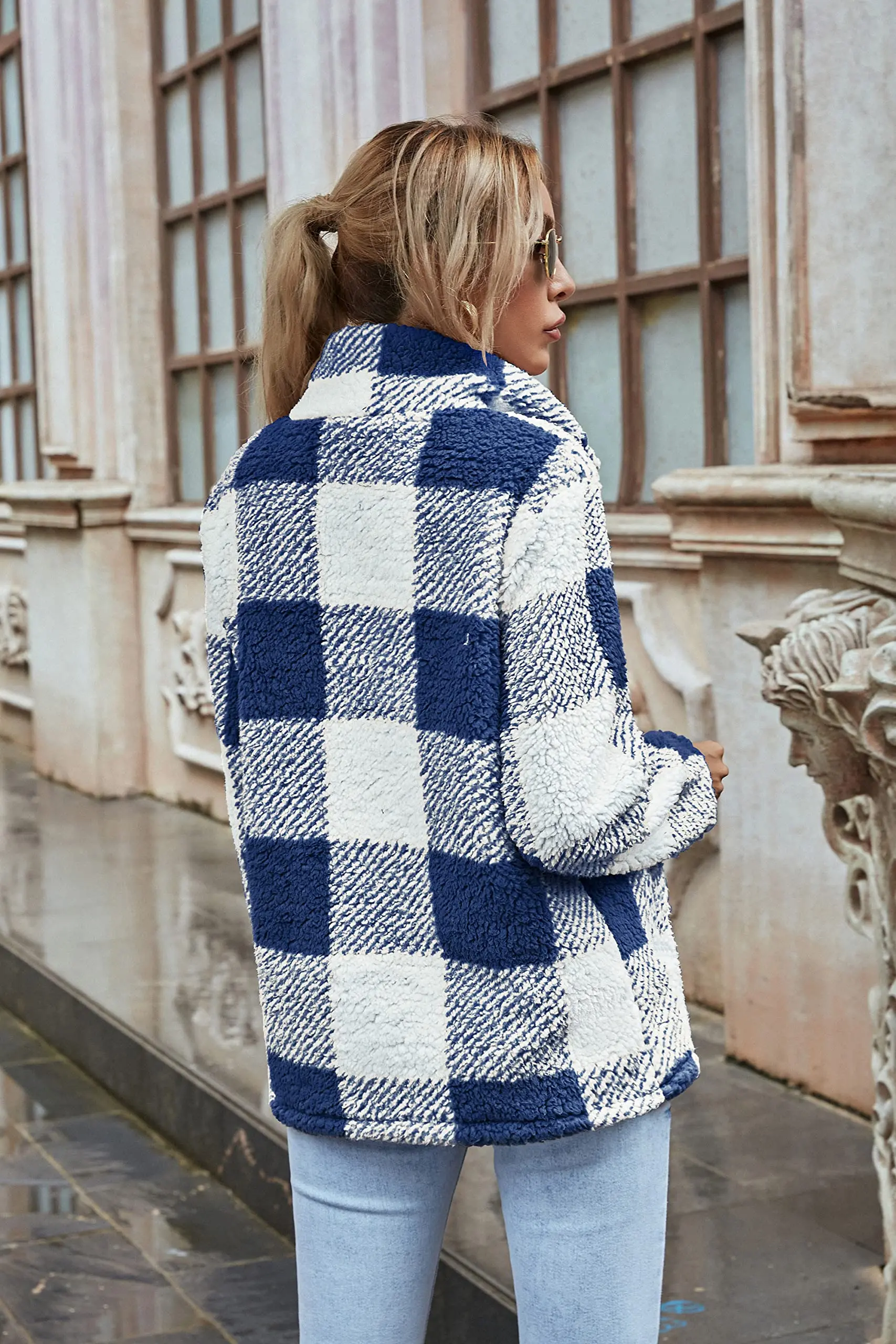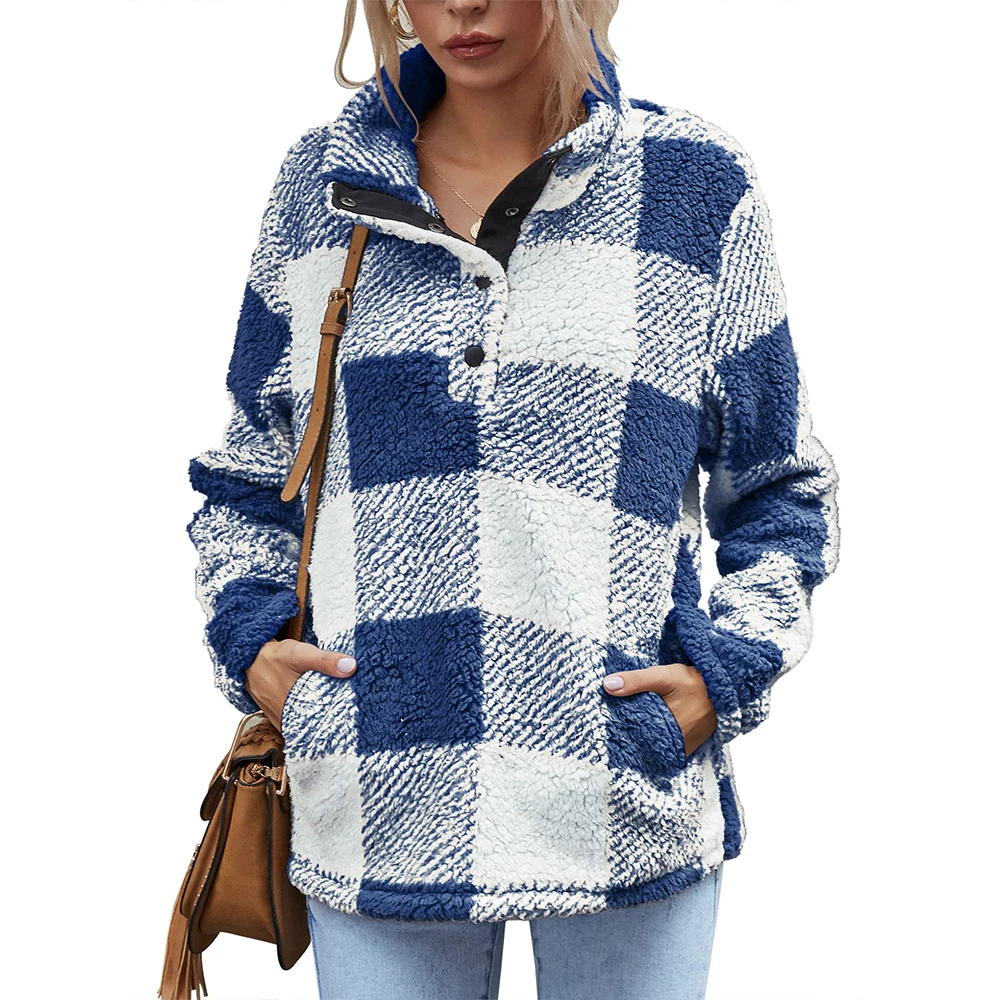 Custom fleece jacket fur buffalo plaid winter thick warm double faced zippers pile pocket fleece women's warm winter coats