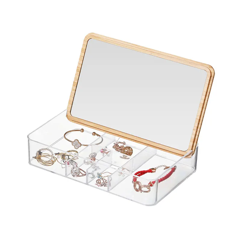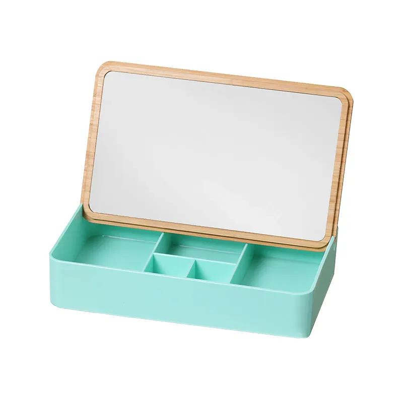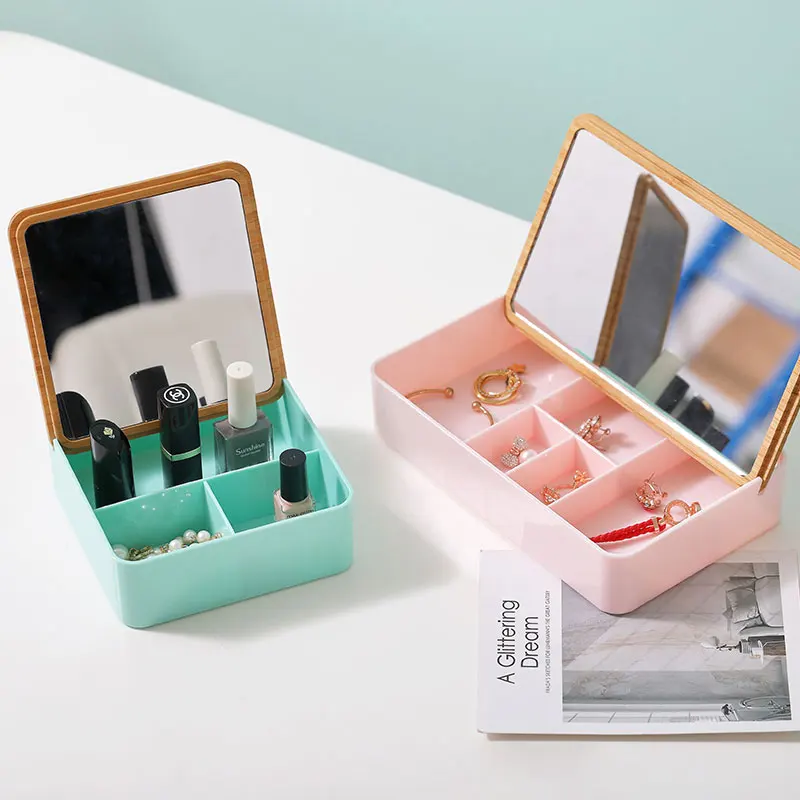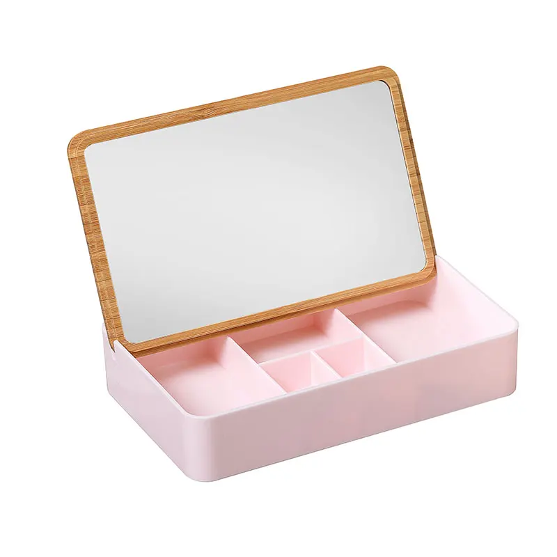 Travel Portable Cute Cosmetic Storage Makeup Organizer Desktop Bamboo Jewelry Storage Box With Mirror