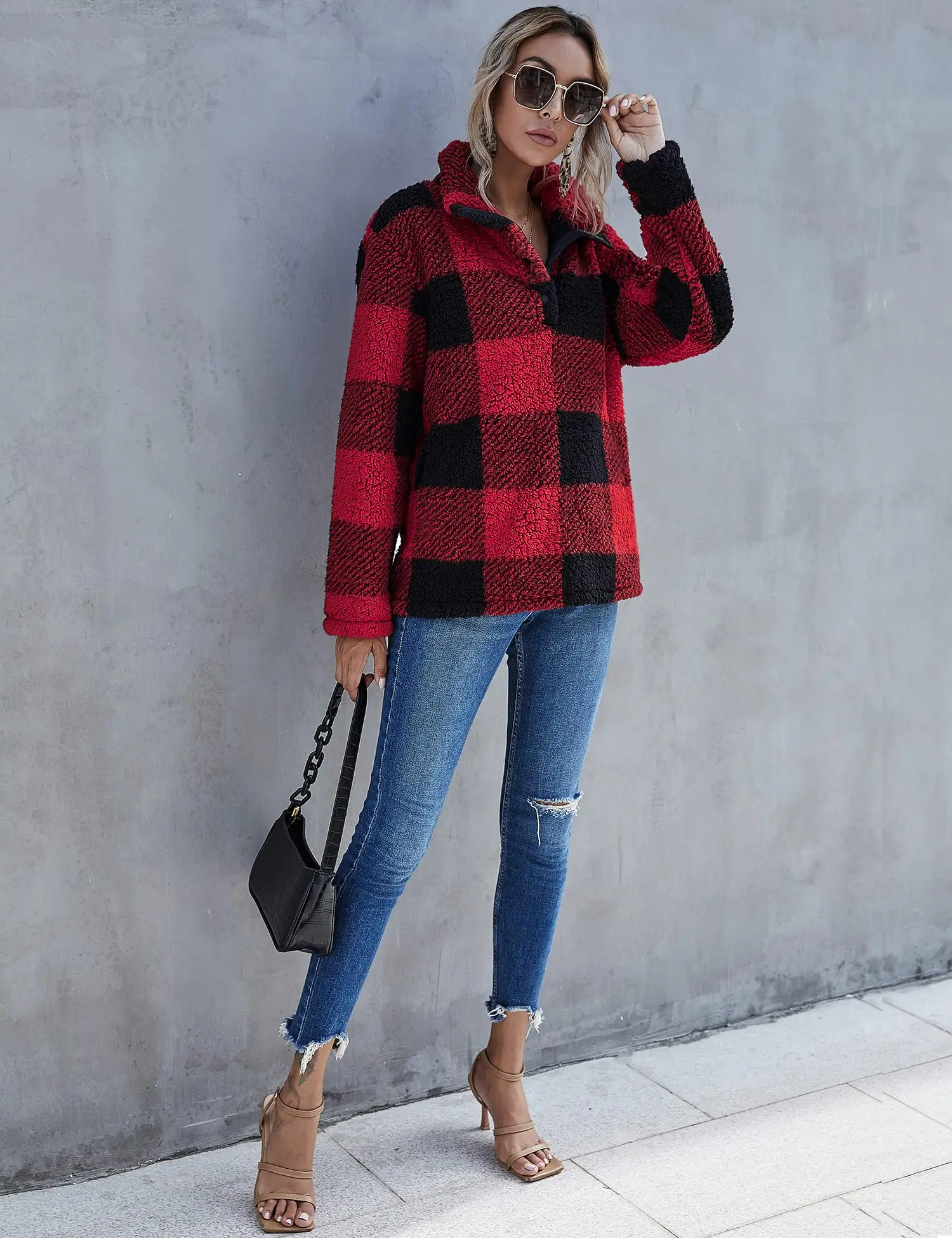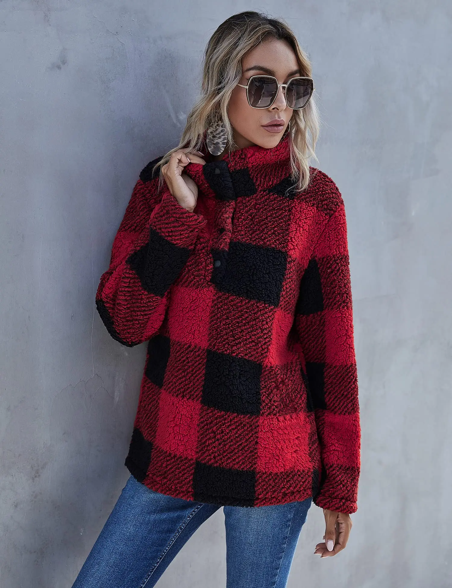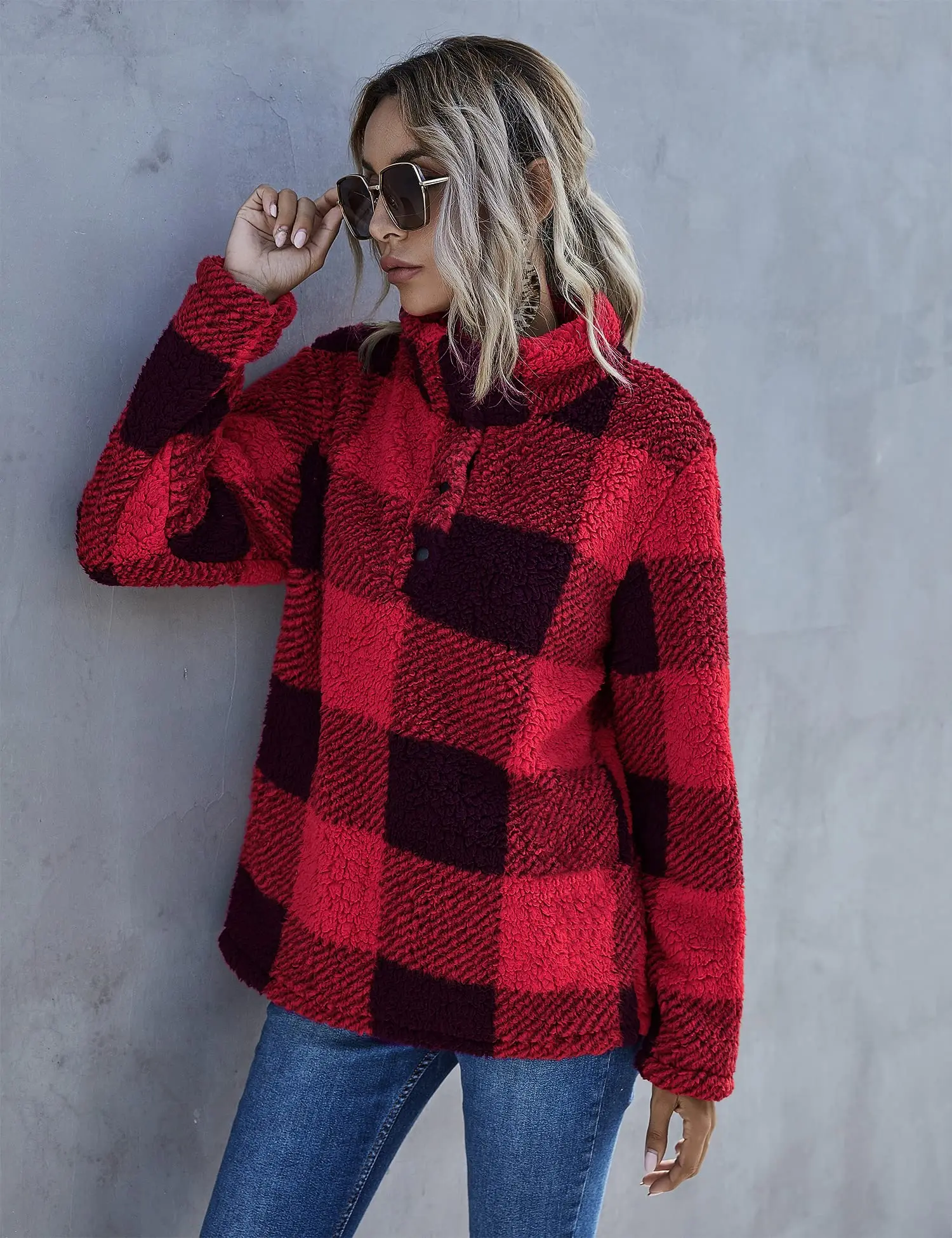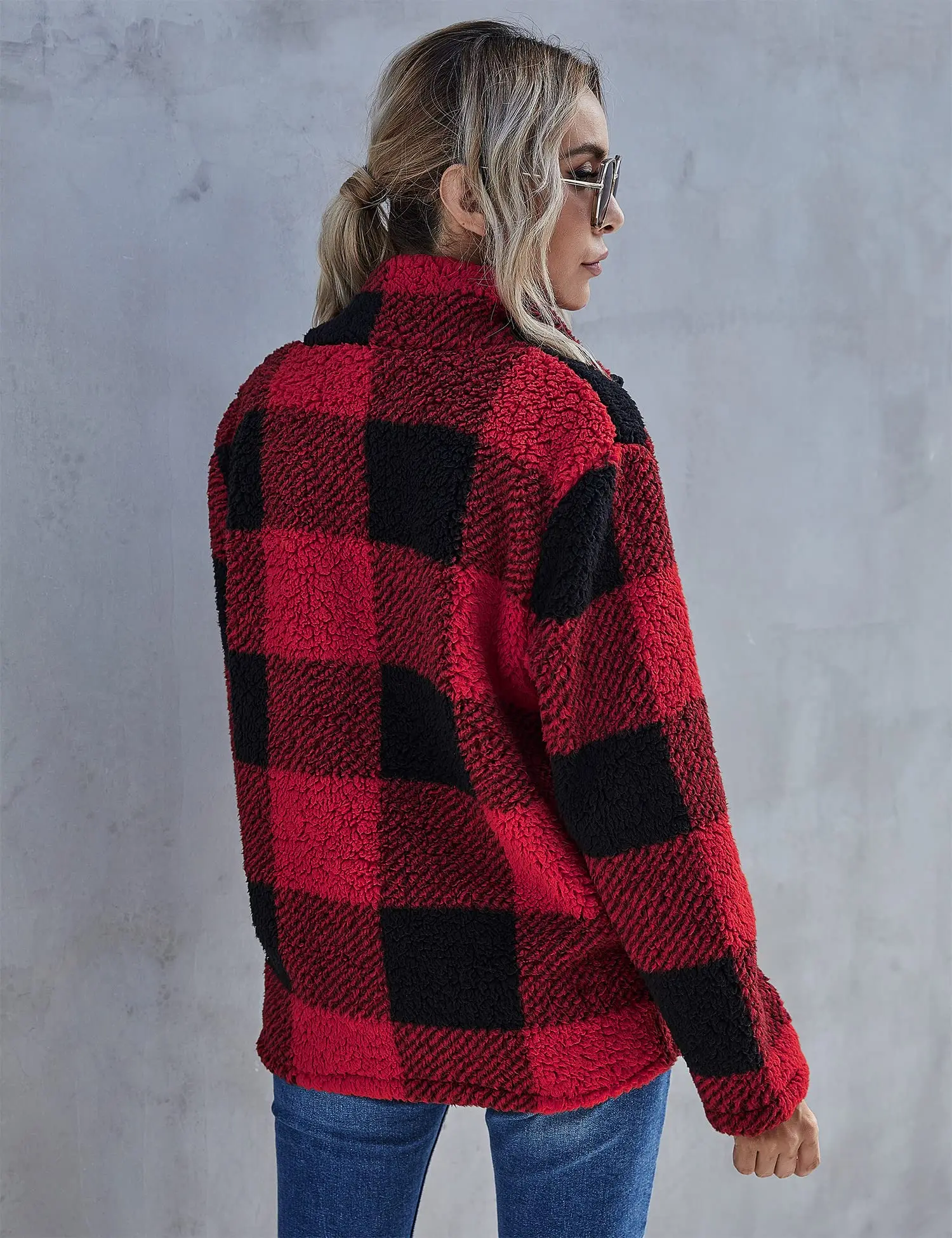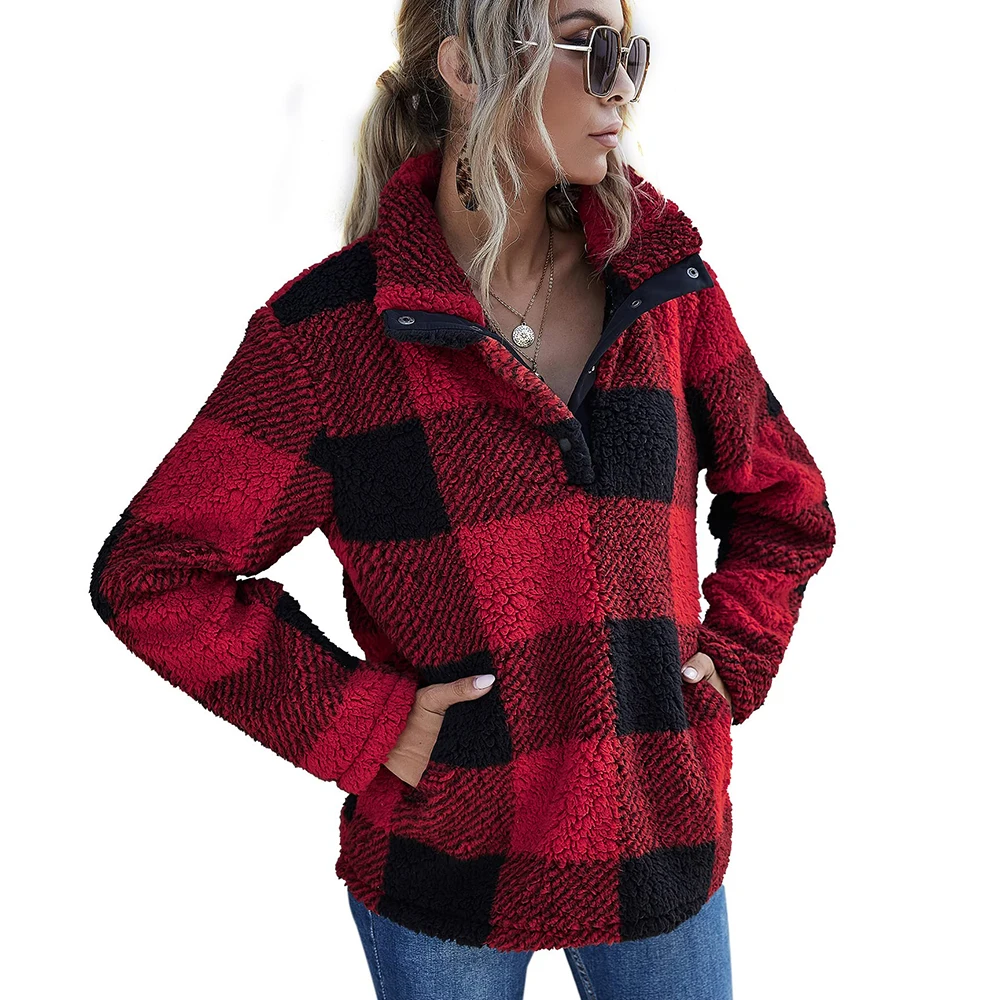 Custom fleece jacket fur buffalo plaid winter thick warm pile pocket fleece pullover women's warm winter coats
