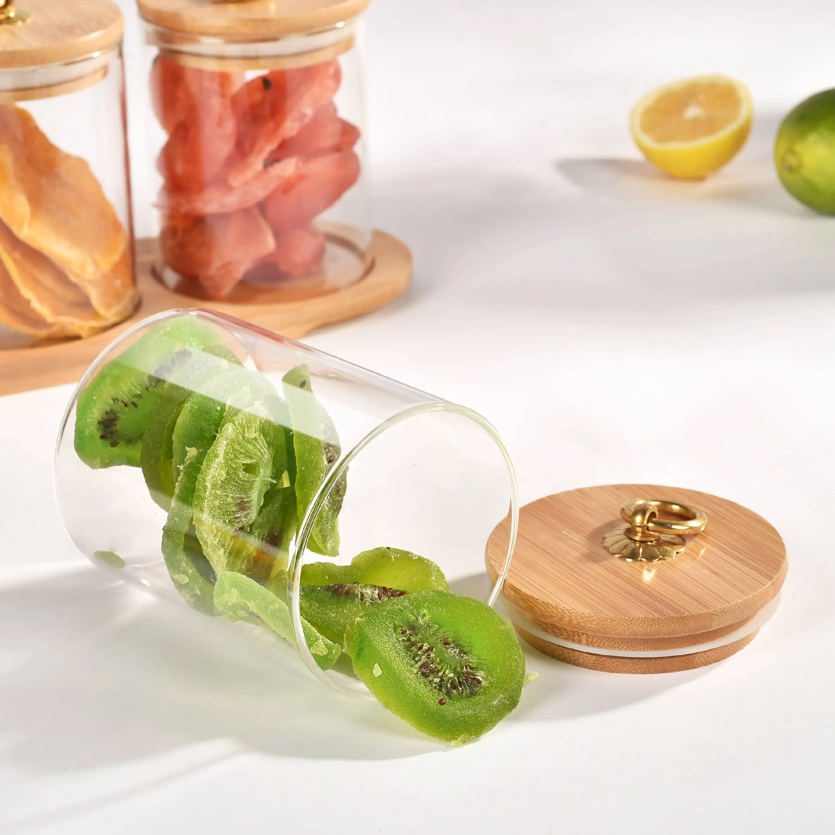15 years glass manufacturer 360ml 8*10 High borosilicate glass jar 3pcs set of Glass storage jar with Copper ring lid and pallet