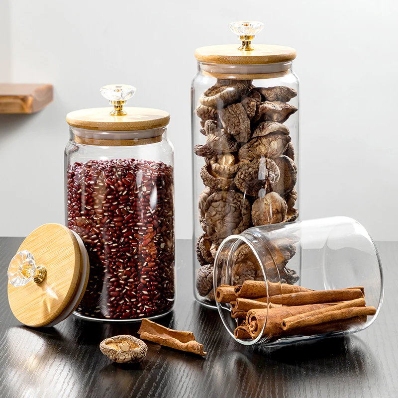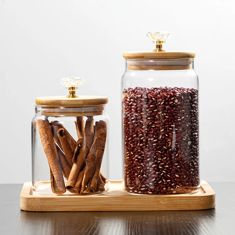 Glass Manufacturer BPA free non-toxic Clear Cylinder High Borosilicate Glass Canistor Jar with Bamboo lid diamond decoration