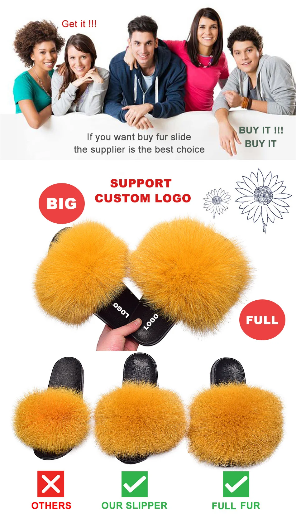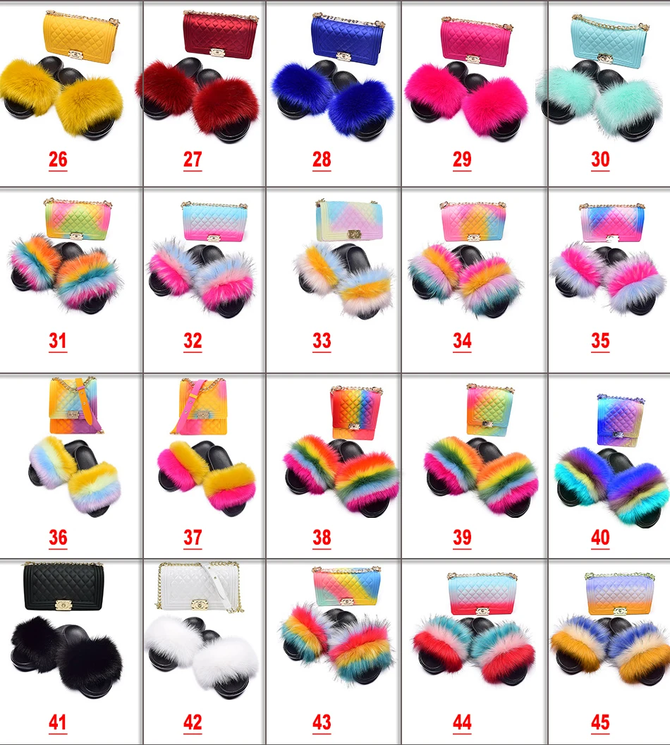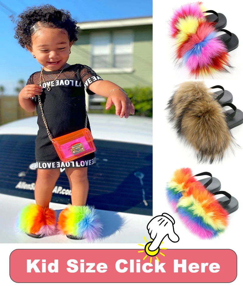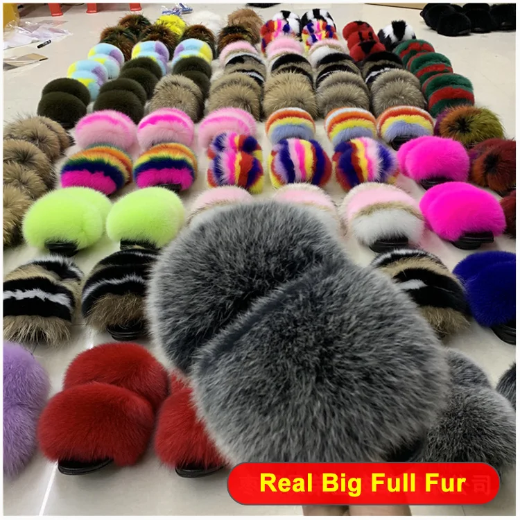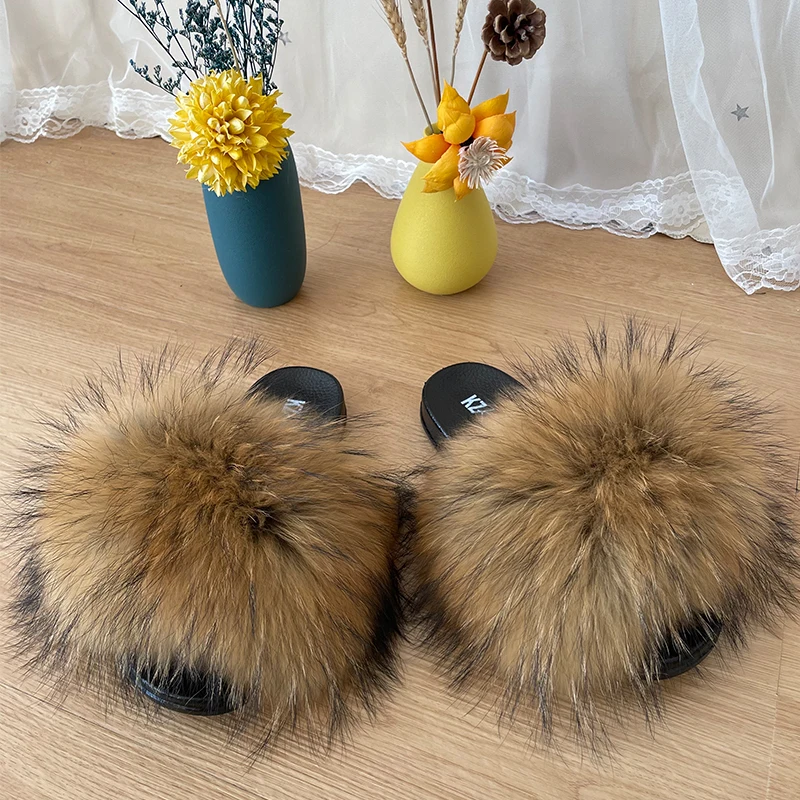 Custom Wholesale Vendor Luxury Big Full Fluffy Real Faux Fox Furry Fur Slide Indoor Kids Womens Sandals Racoon Fur Slippers