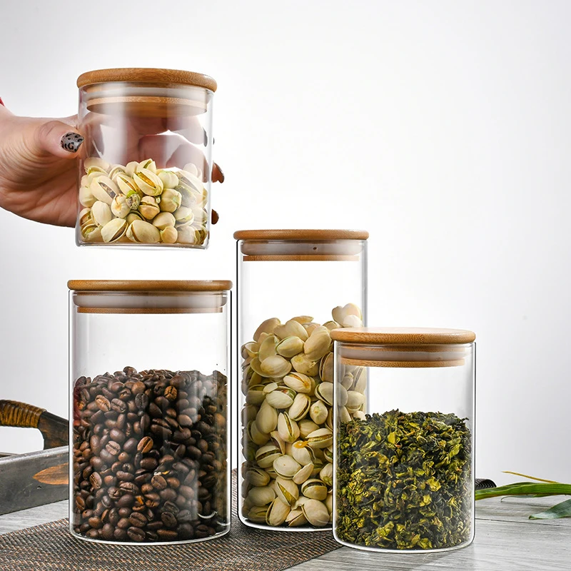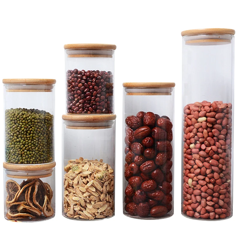 Eco-friendly Straight Cylinder Seal Tank High Borosilicate Food Airtight Storage Glass Jars with Bamboo Wooden Lids