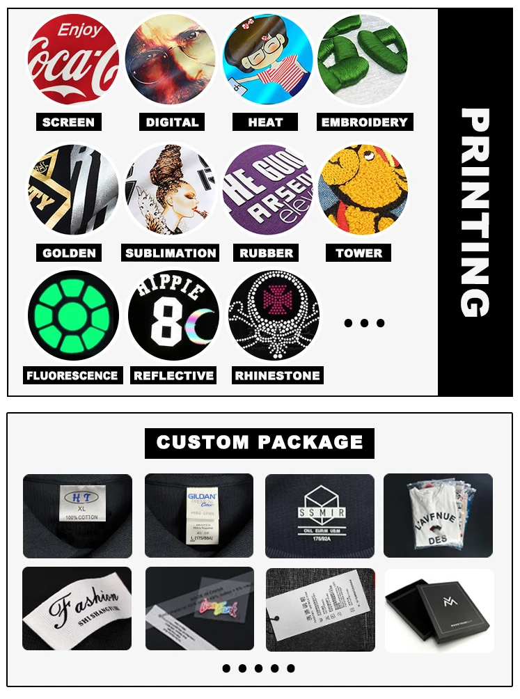 Heat Transfer Printing, Silk Screen Printing, Digital Garment Printing, Foam Printing, Silicone thick Printing, Lettering Film,Luminous, Embroidery, Embroidery Patch, Printing Label, Woven Label
