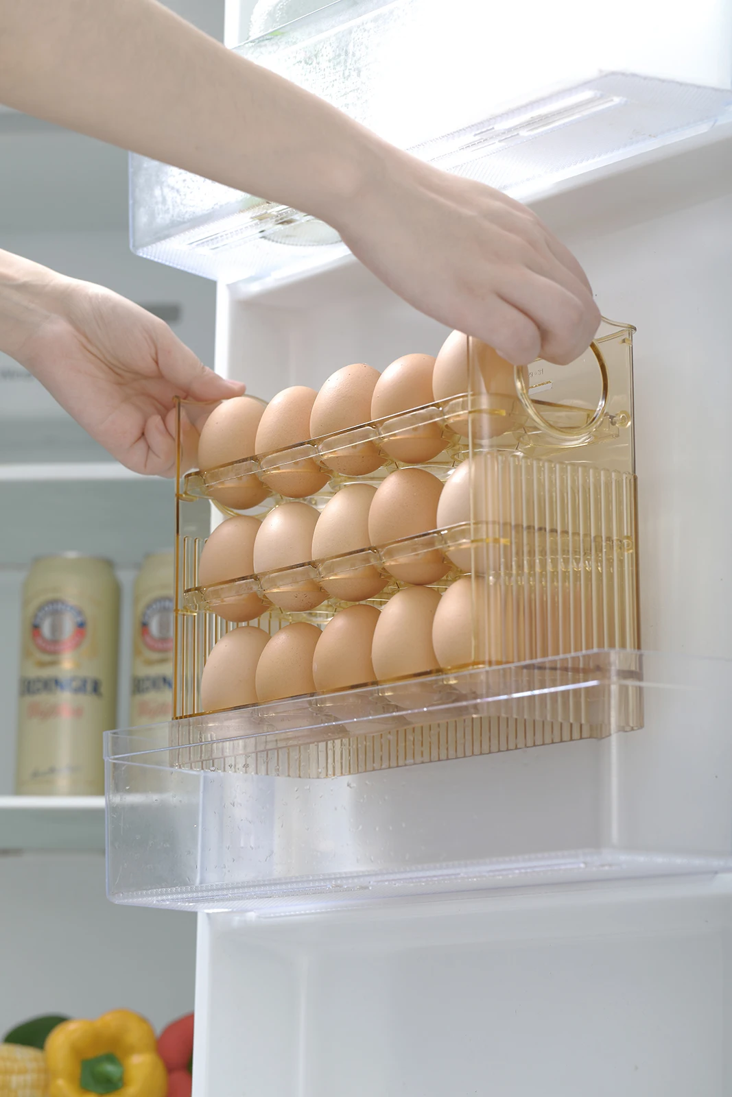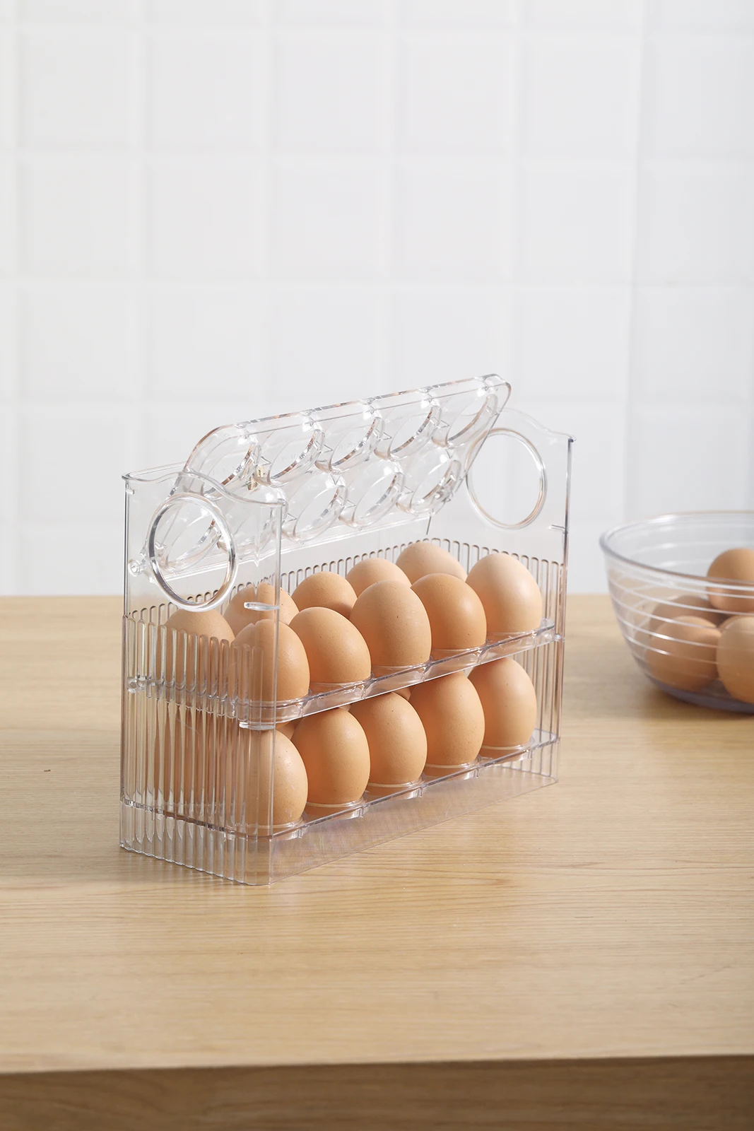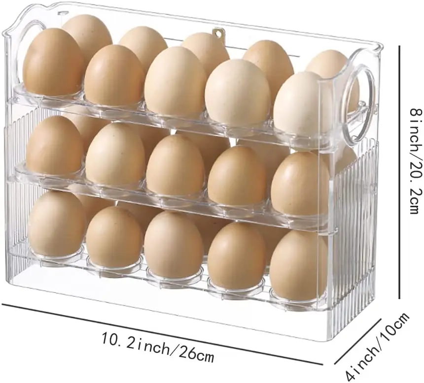 * 【Large Capacity 】Our 3-Layer Egg storage container for refrigerator can be stacked easily and organized. 3-layer egg rack which can store 30 Eggs which is enough to meet the needs of a family for a week.With this egg storage box you can easily use it in your refrigerator door or shelves, help you save more space. * 【Amazed Design】The Egg tray has an flipped function, which does not need to open the lid when in use, allowing you to easily load eggs. When you do not put eggs, the Egg tray will flipped automatically,In your busy routine, it will prove to be the most convenient egg tray you would ever have. * 【Safe Materials 】Egg organizer for refrigerator are made of food-grade PP materials, this egg storage bin more durable and clear. Easy to clean without absorbing stains or smells. Perfect for refrigerator storage, also for picnic party, travel and more. * 【Transparent Design】The translucent Eggs container for refrigerator allows the quantity of the remaining Eggs to be clear at a glance which is convenient for timely replenishment. The timing function helps us record the storage time and helps eggs to stay fresh for a long time. * 【Easy To Clean 】The Egg tray is removable , allowing you to load Eggs and clean the tray easily. Use warm water to wash it directly or wipe with a rag. The smooth finish ensures very easy cleaning.