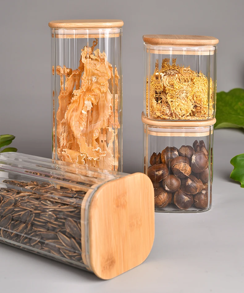 wholesale Factory 10cm 750ml -2.3L Striped Square Food Storage Jar borosilicate glass container kitchenware with Bamboo Lid