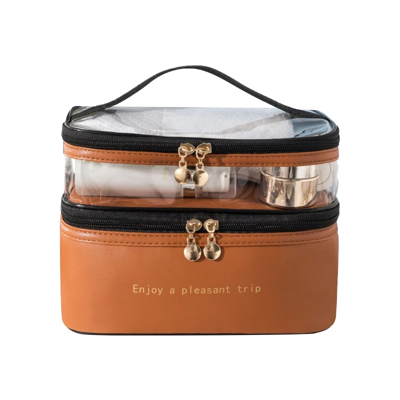 2024 Hot Selling Women Large Makeup Bag Double Layer Travel Cosmetic Bag Portable PU Leather Toiletry Bag