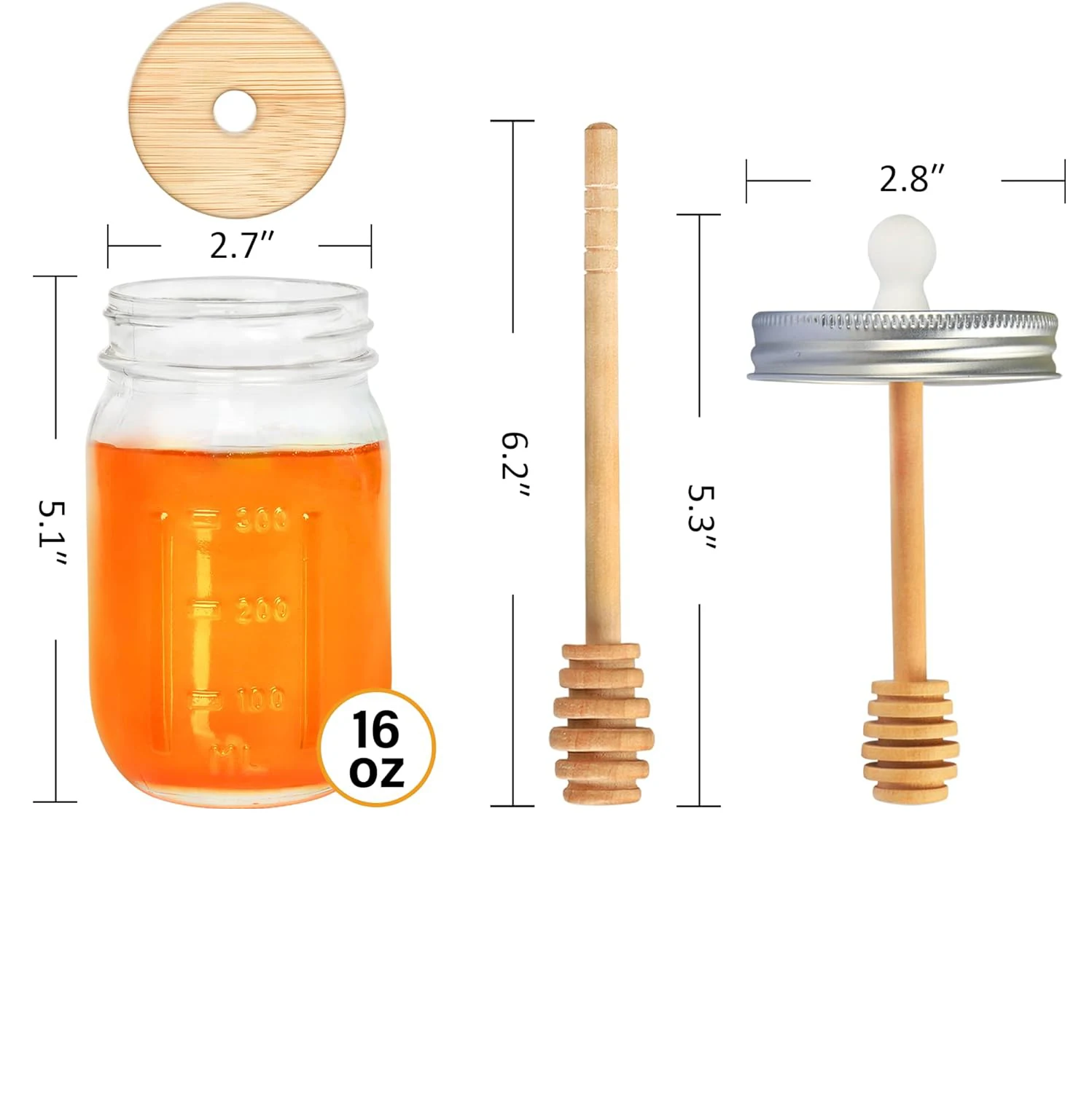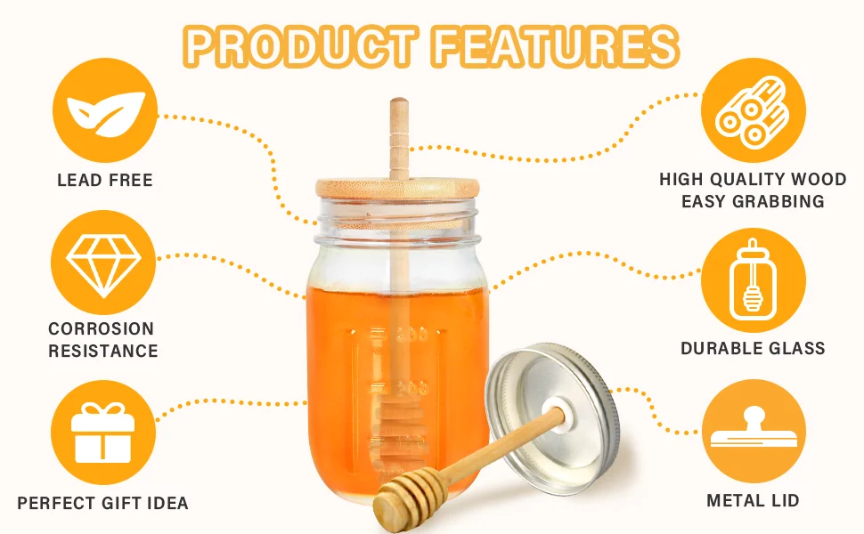 Custom 16oz Clear Glass Honey Jar With Lids Glass Food Container Jam Glass Honey Jars With Dipper