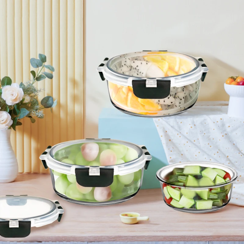 Kitchen Microwave BPA Free Round Airtight High Borosilicate Glass Storage Food Meal Prep Containers Lunch Box With Locking Lid