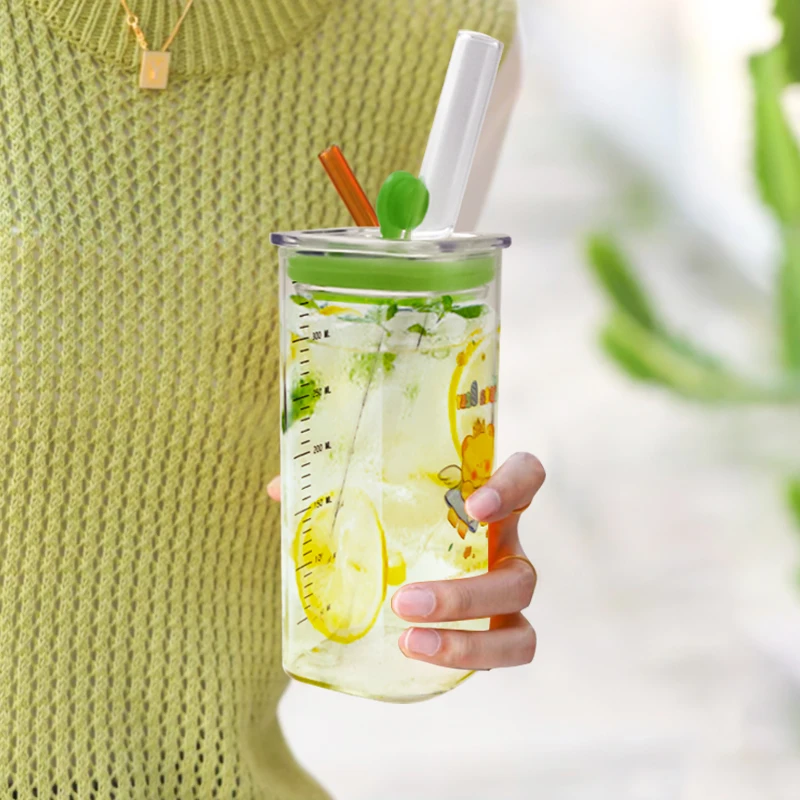 New Arrival Drinkware Square Transparent Bear Pattern 350ml Glass Drinking Cup With Scale Glass Milk Coffee Juice Cups With Lid