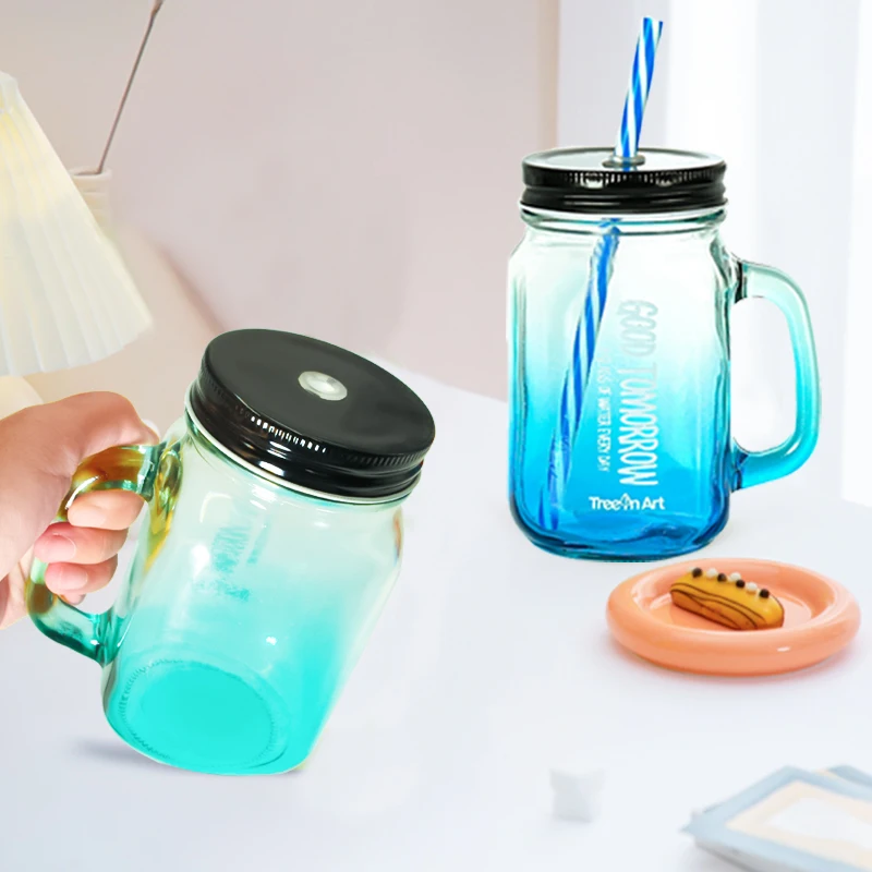 Hot Selling Colorful 350ml 500ml Heat-Resistant Glass Mason Cups Mugs Custom Leakproof Water Drinking Cup With Handle And Straw