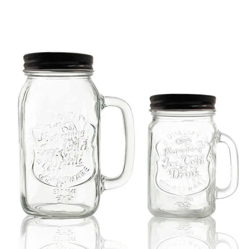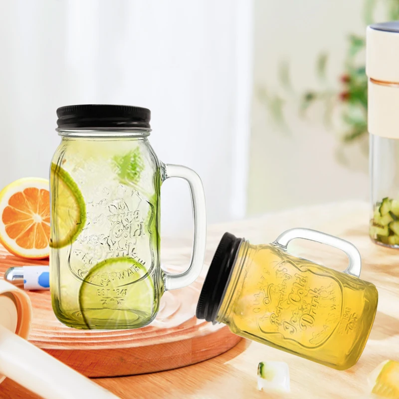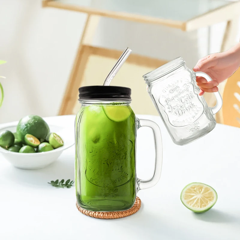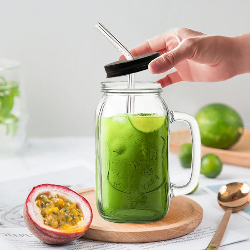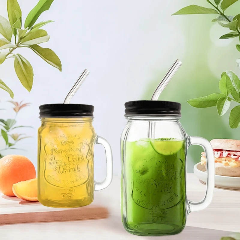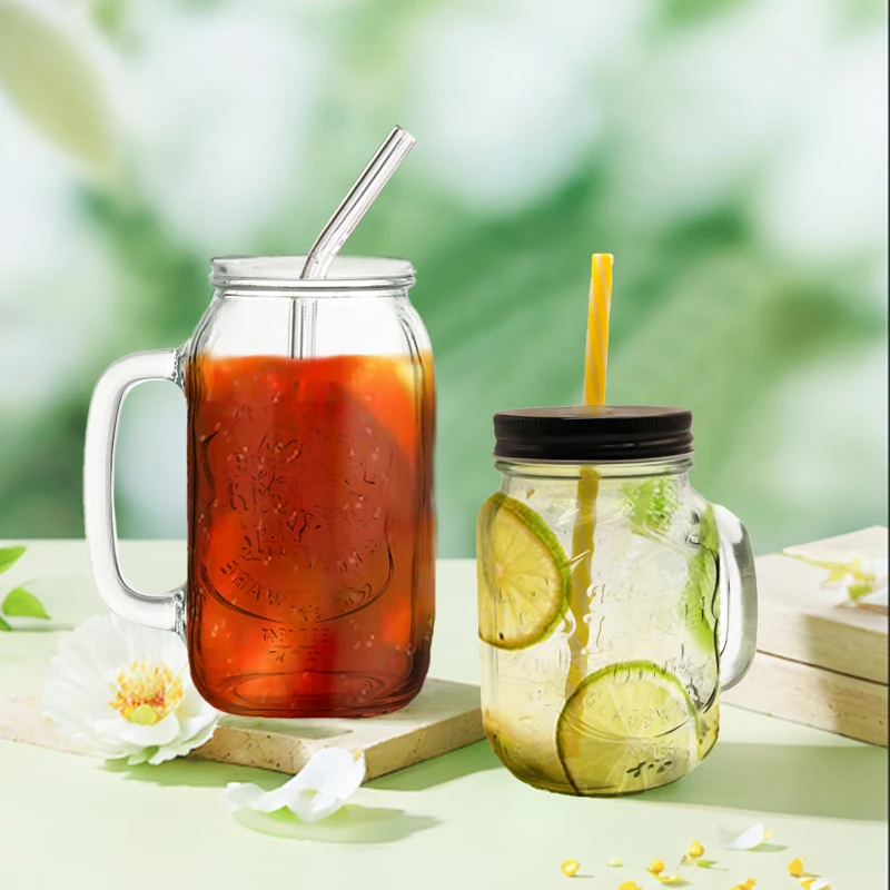 Wholesale Transparent Milk Juice Beer Cold Drinking Glass Mugs Cup With Handle Custom Logo Glass Mason Cup With Lid And Straw