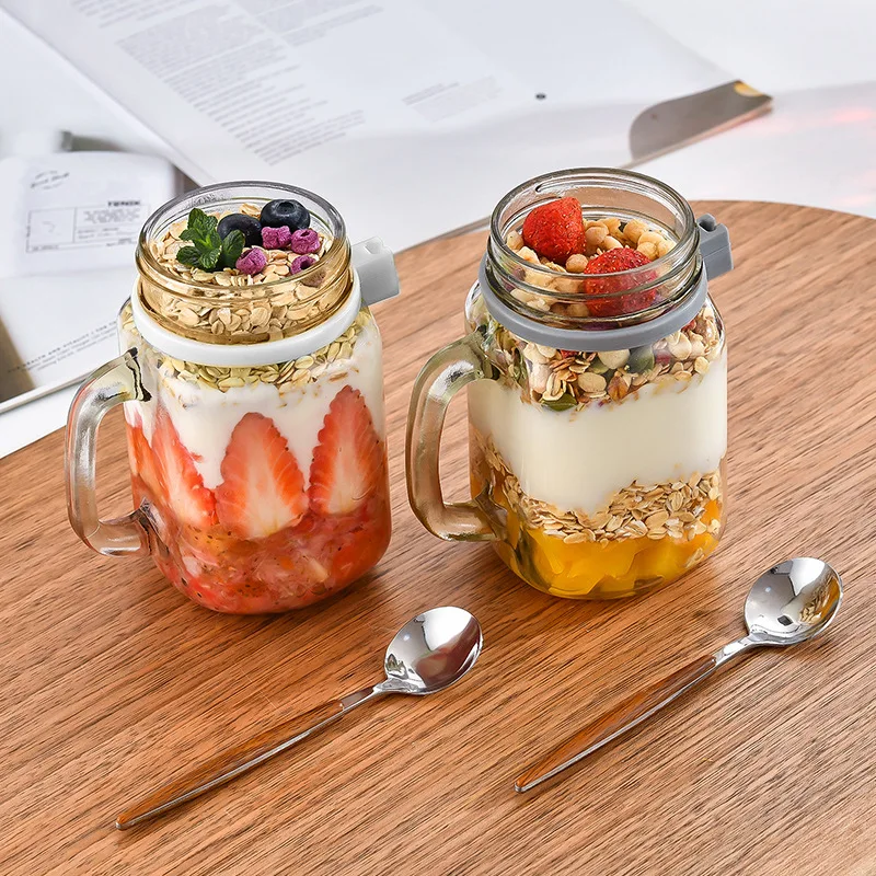 Hot Sale 350ml Custom Logo Overnight Cereal Oat Cup Storage Overnight Oats Glass Jars With Handle Lid Spoon