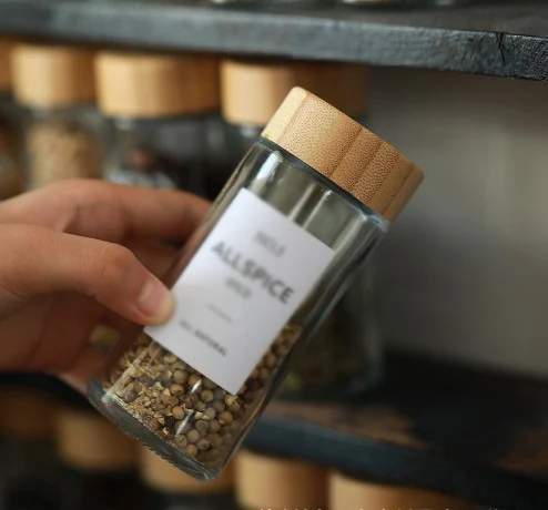 Wholesale Custom Logo 100ml Transparent Glass Bottles For Spices Round Glass Spice Jars With Bamboo Lids Set