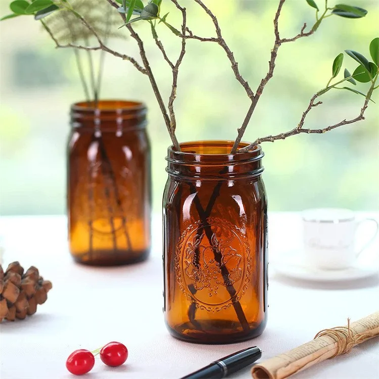 In Stock Food Storage Wide Mouth 32oz Canning Mason Jars For Jam Pickle Empty Amber Glass Mason Jar With Metal Screw Lid