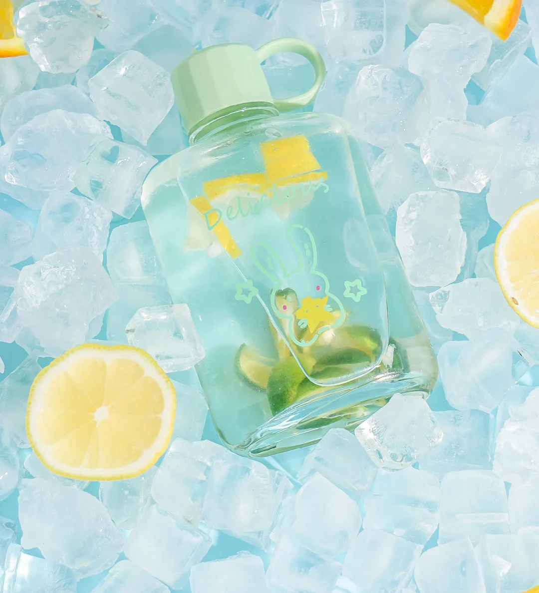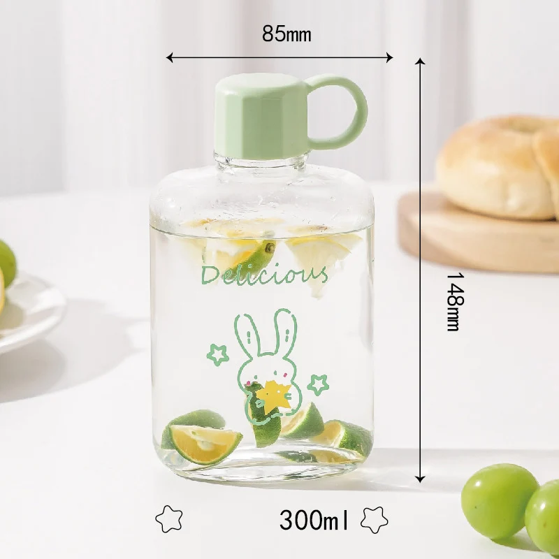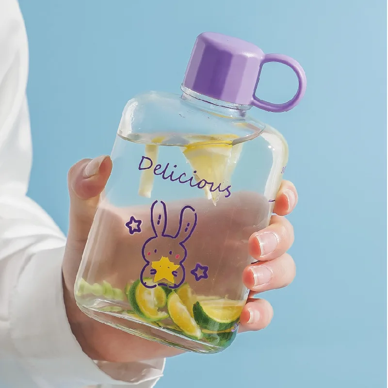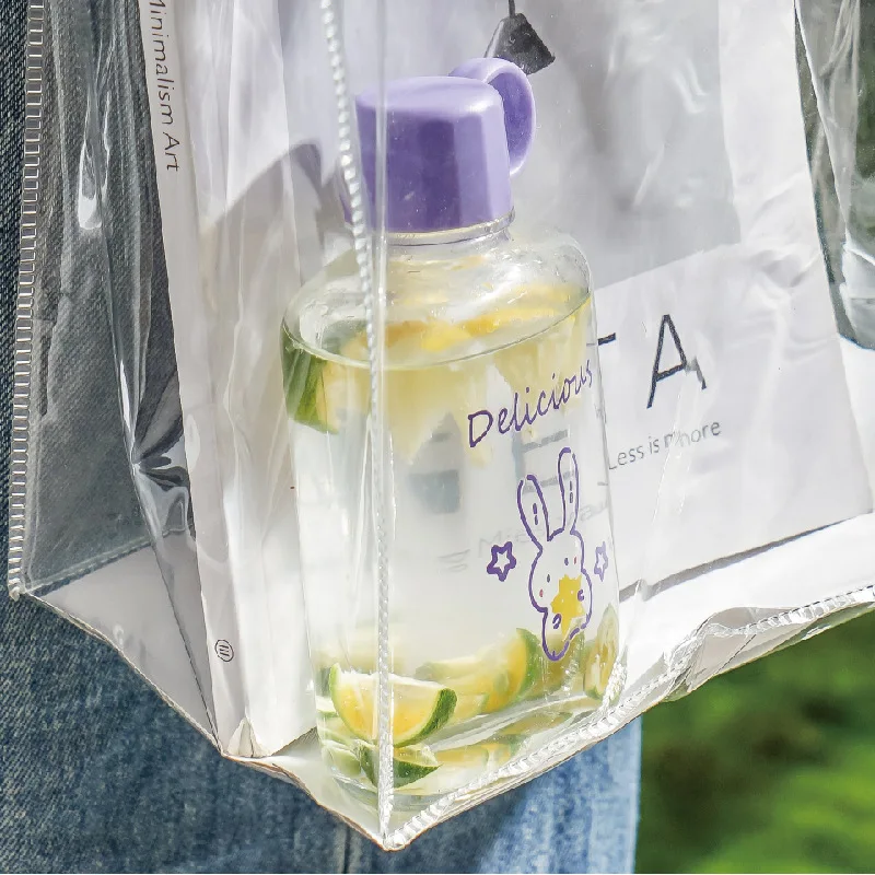 New Design Portable Transparent Flat Square Glass Bottles For Water Juice Tea Cartoon Pattern Water Drink Glass Bottle With Lids