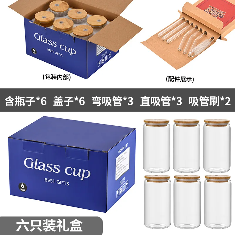 Glass Cups with Bamboo Lids and Straws 16oz Can Shaped Drinking Beer Glasses Cup For Iced Coffee