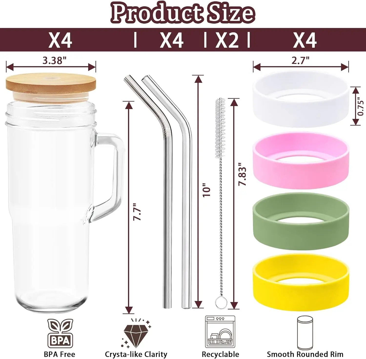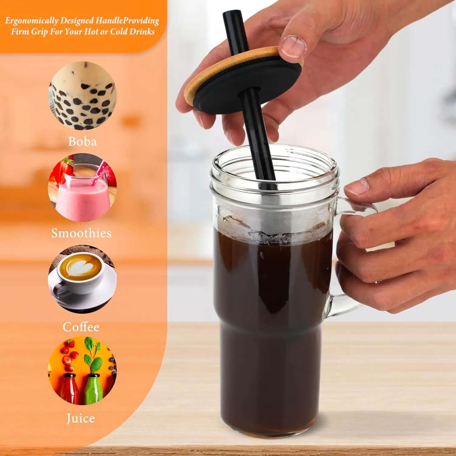 4-Pack 24oz Mason Jar Drinking Glass Tumbler Cups with bamboo lid and straw