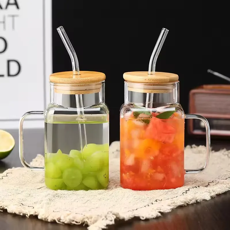 Custom JXY 16oz Clear Glass Tumbler Can With Handle Sublimation Soda Coffee Square Glass Cups With Bamboo Lids And Glass Straw