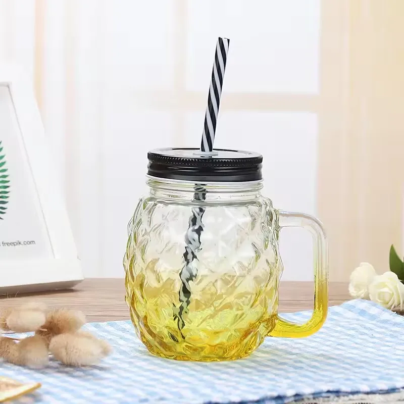 Factory Hot Sale 12oz Colorful Hammer Pattern Glass Bottles Drink For Juice Glass Beer Soda Can With Aluminum Lid And Straw