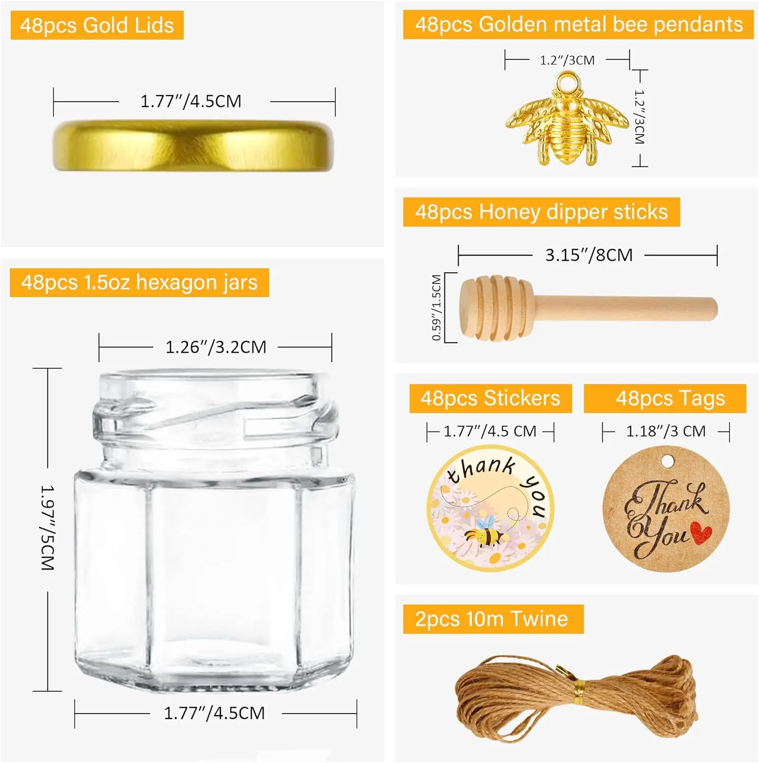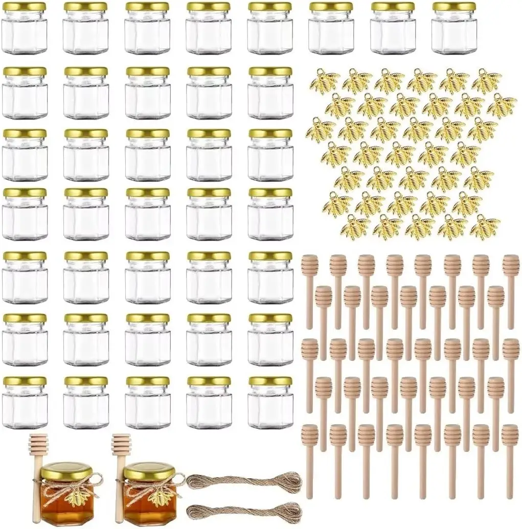 Custom logo Hot sale Mini 1.5oz 2oz 4oz 5oz 7oz Hexagonal Clear glass honey jar with Wooden Dipper And Gold Lid