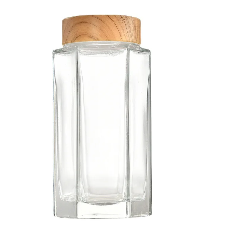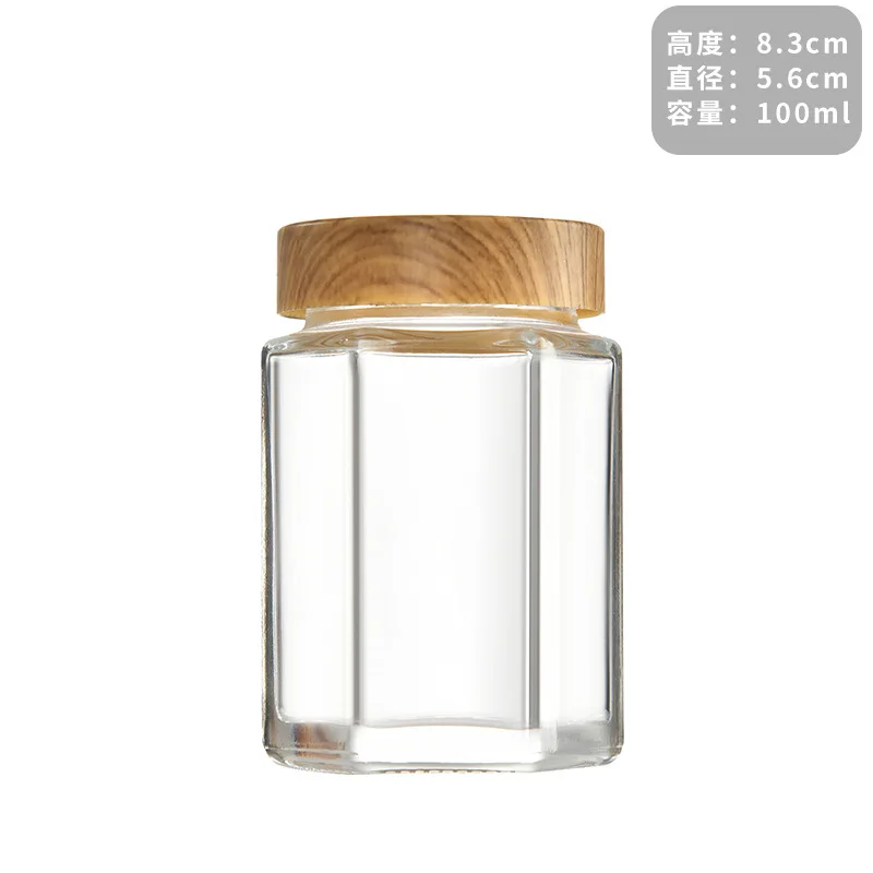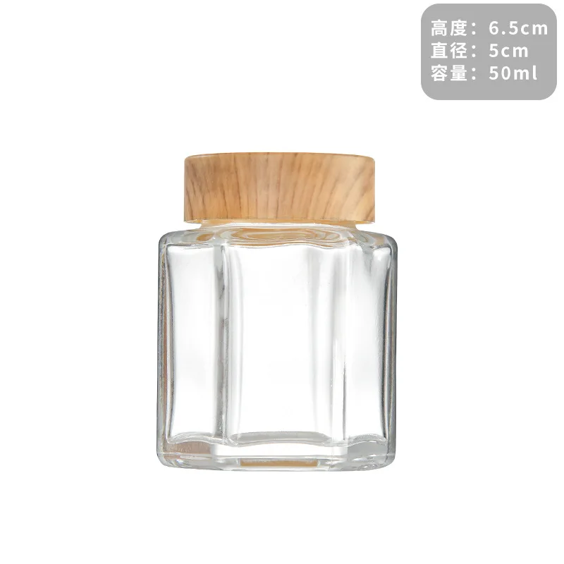 High Quality Customized Large Hexagon Shape Clear Glass Jar with wooden lid for honey jams food storage bottle 50ml 180ml 280ml