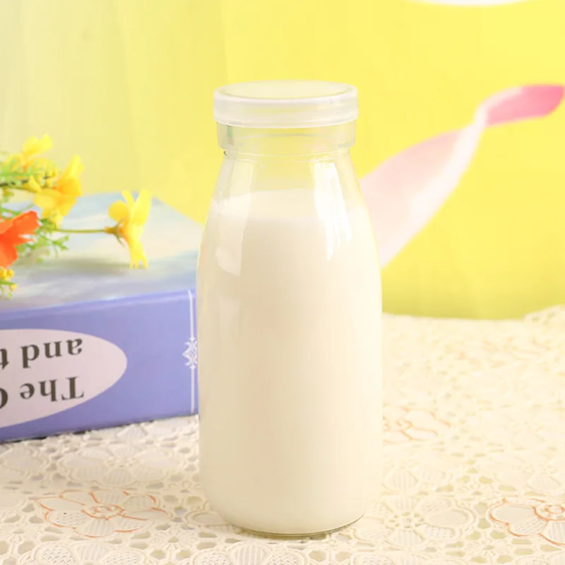 Wholesale Clear Fruit Juice Beverage Bottle Glass Jar Reusable 200ml Round Coffee Juice Milk Glass Bottle With Plastic Lid