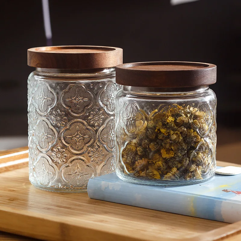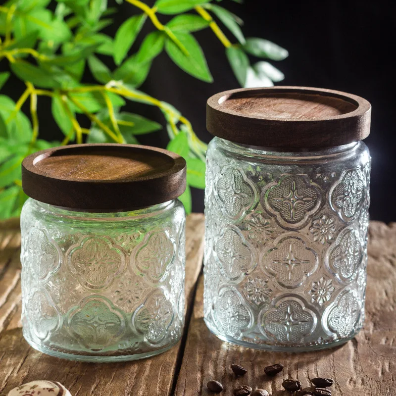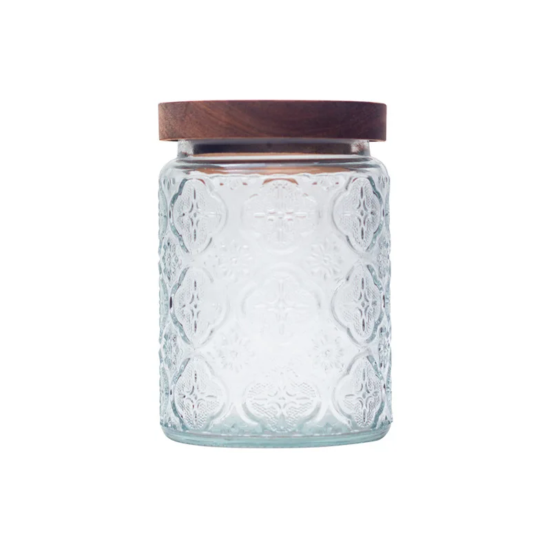 Round classic embossed glass food storage carved jar with airtight wood lid for sugar cookie and candy glass storage jar