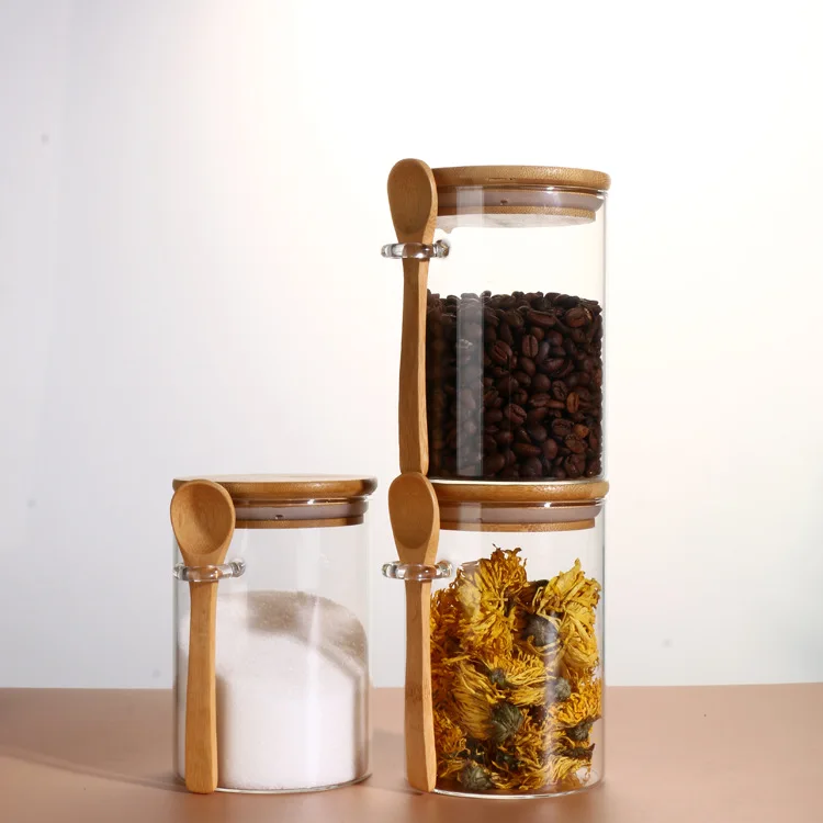 Kitchen Organization Eco-Friendly High Borosilicate Glass Food Spice Jar Clear Glass Storage Jar With Bamboo Lids And Spoon