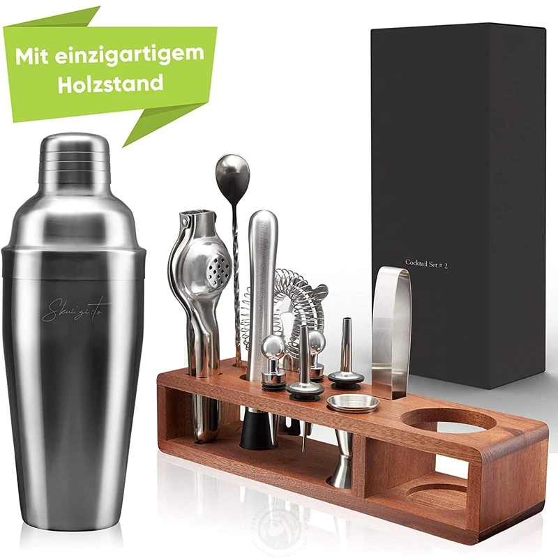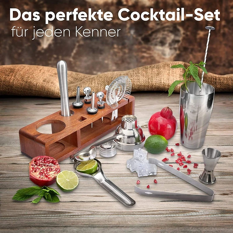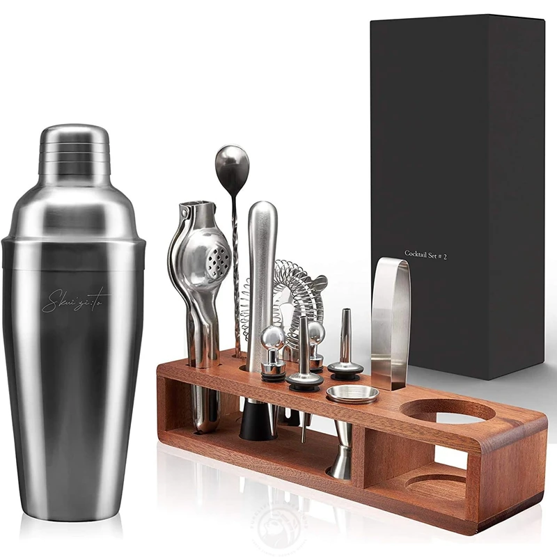 12-pieces Perfect Home Bar Tool Set with Stylish Wooden Stand Bartender Kit Shaker Mixing Spoon Muddler for Barware Set