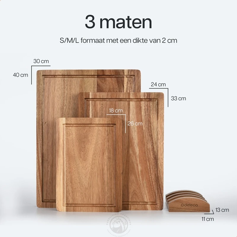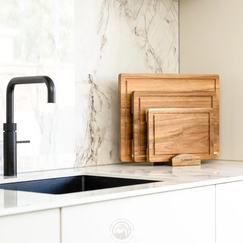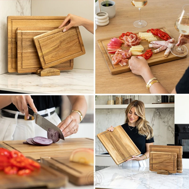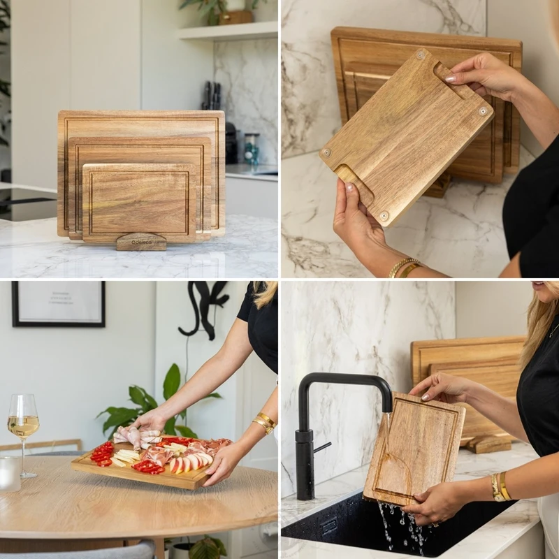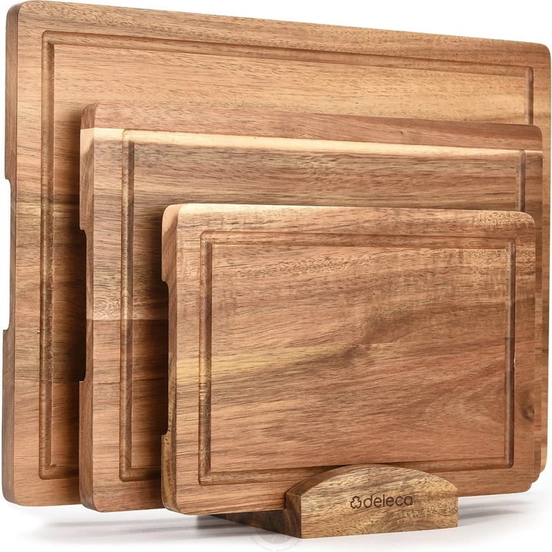 Set of 3 Acacia Wood Large Cutting Board Set with Holder Thick Chopping Board, Butcher Block Wooden Trays