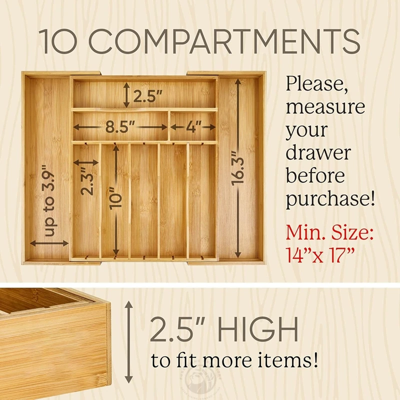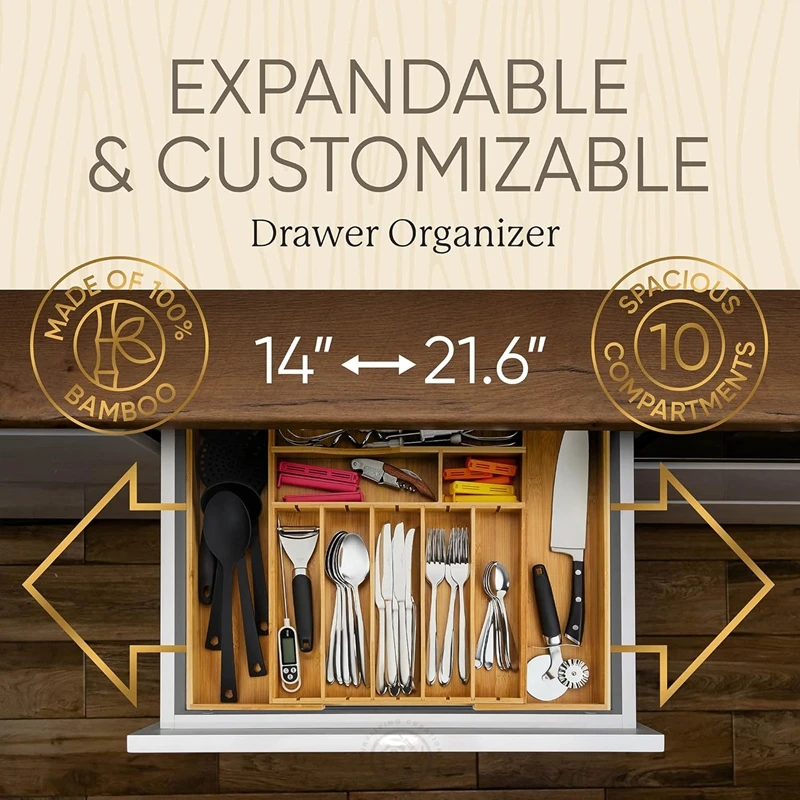 100% Bamboo Expandable Kitchen Luxury Bamboo Kitchen Drawer Organizer Silverware Cutlery Tray Deep utensil drawer organizer