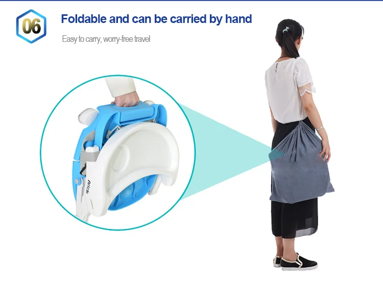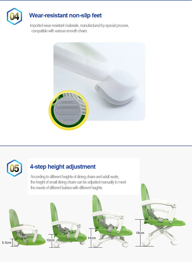 With removable tray. 4 height adjustable positions on seat. 3 points safety belts. Fold-up design is easy for travel. Green,Blue,Pink and gray for choice. OEM of color is allowed.